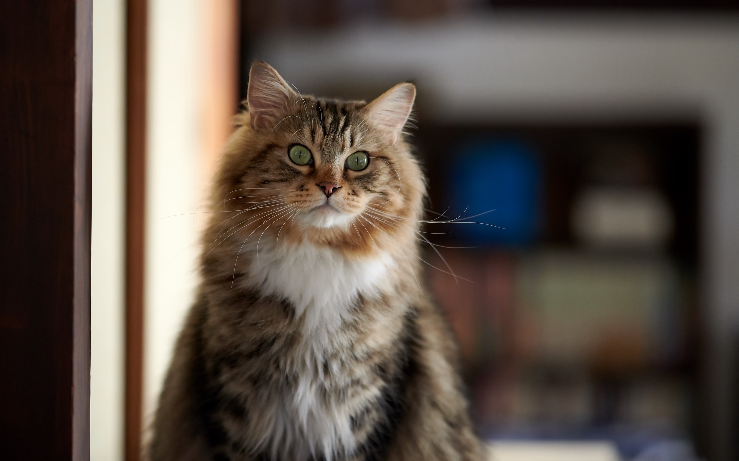 Description: A cat sitting on a table looking at the camera with a blurry background of a bookcase in the background.