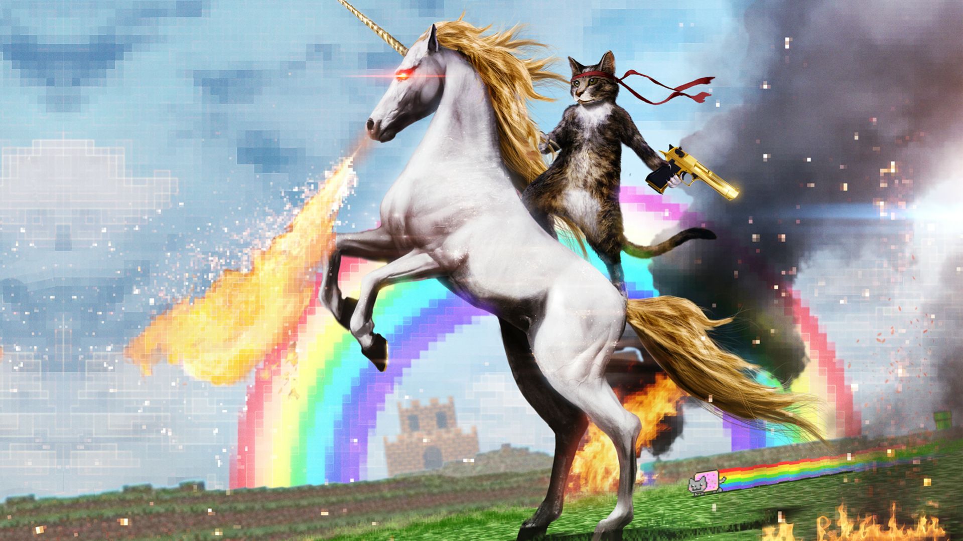 Description: A cat riding a unicorn on a rainbow colored field with a rainbow in the background and a rainbow in the foreground.