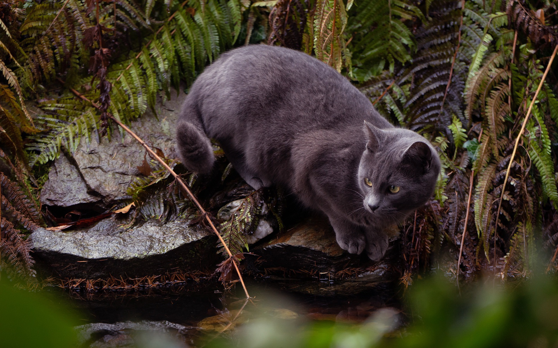 Description: A cat standing on a rock in a forest next to a stream of water and plants and rocks and ferns.