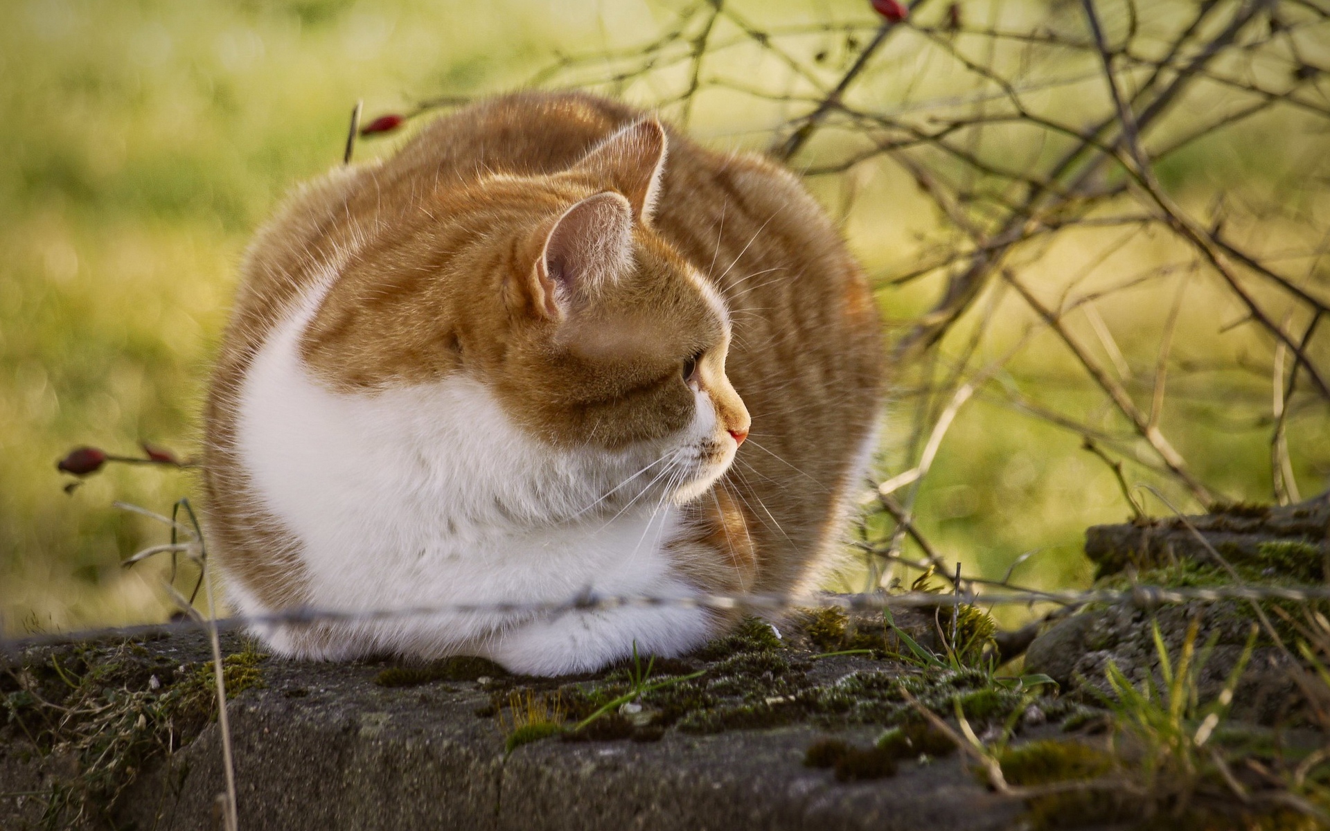 Description: A cat sitting on a rock in the grass near a tree branch and a bush with leaves on it.