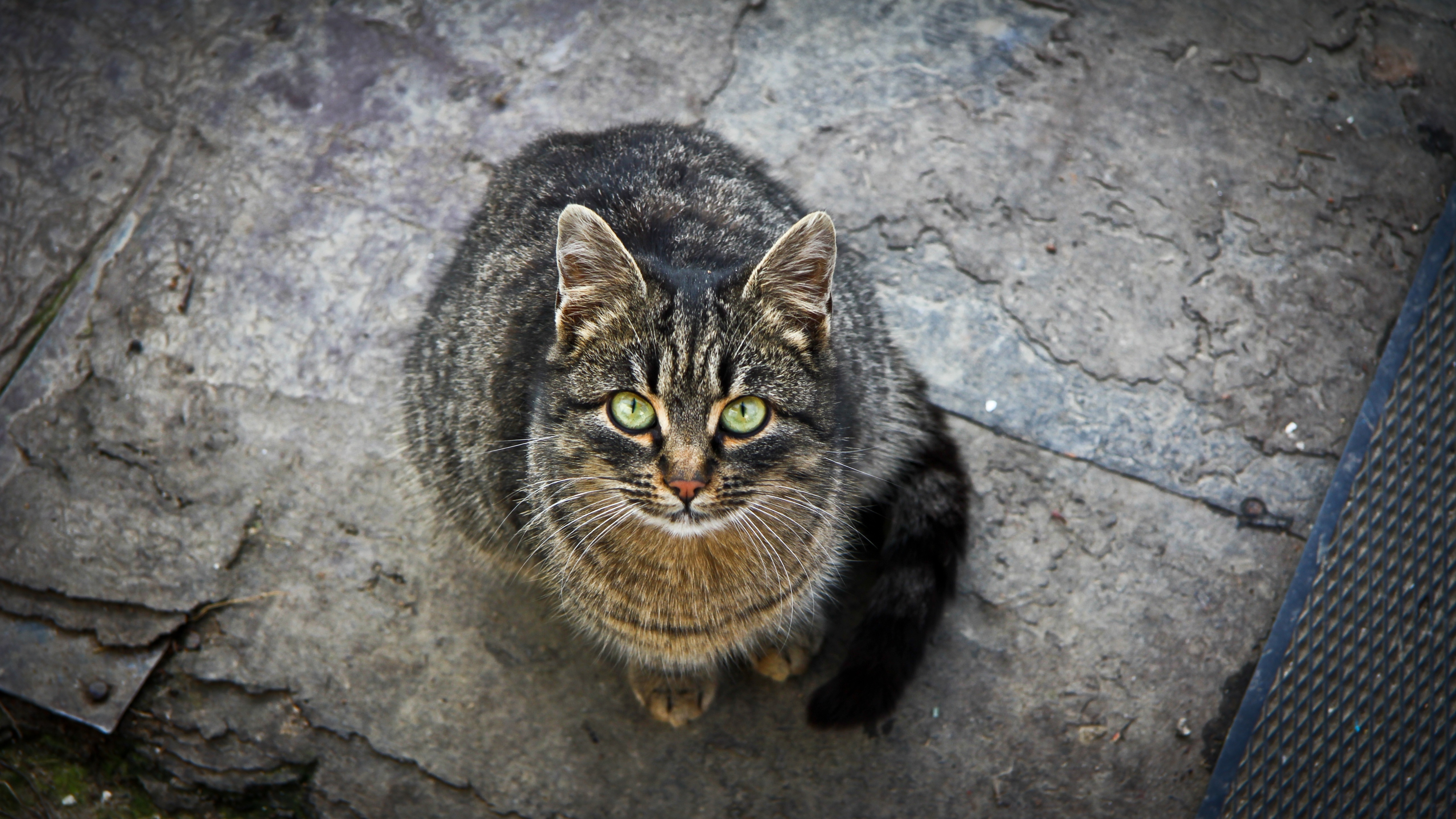 Description: A cat sitting on a rock looking up at the camera lense of the camera man's eye.