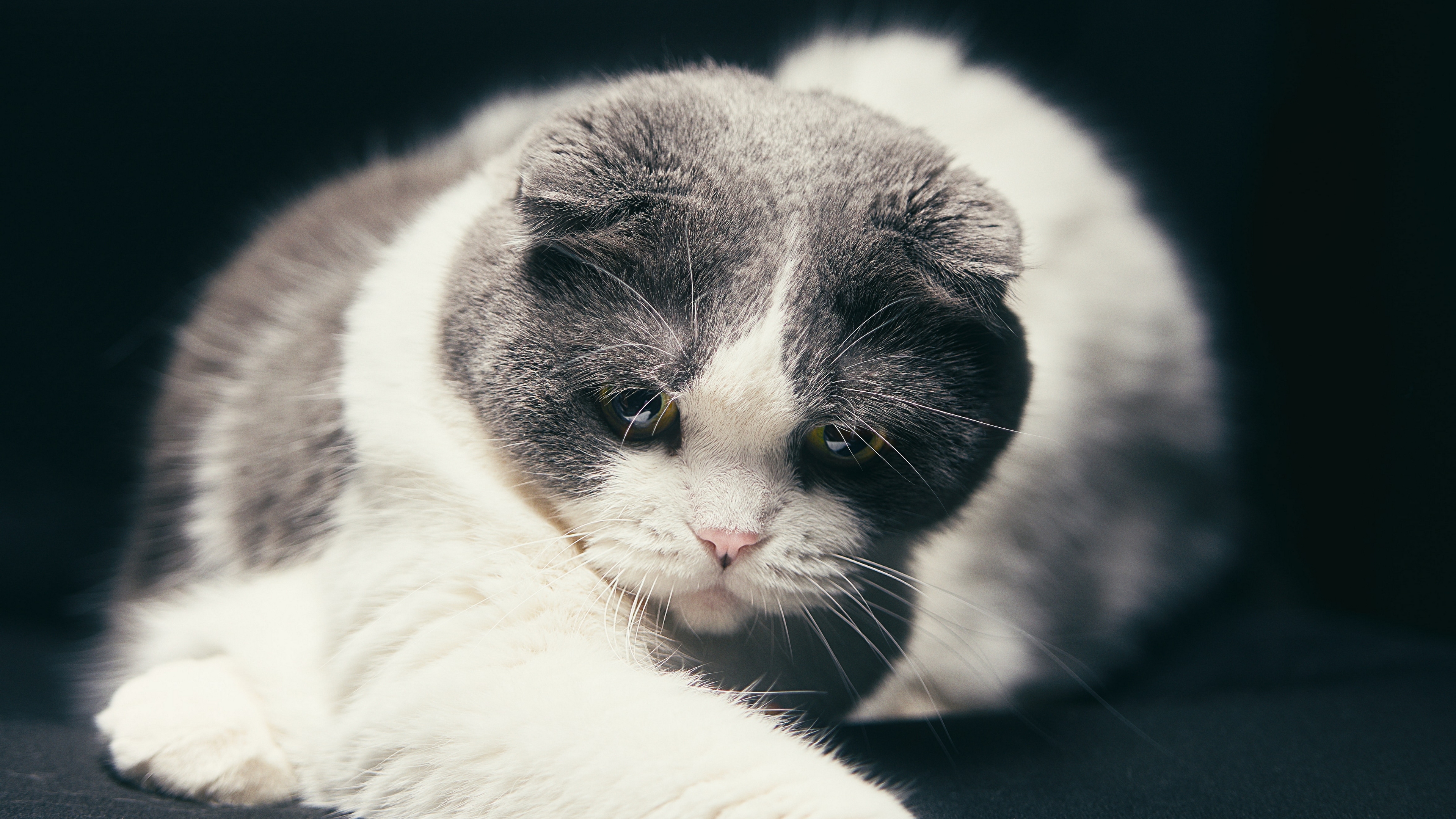 Description: A cat sitting on a black surface with its paw on the ground and looking at the camera with a serious look on its face.
