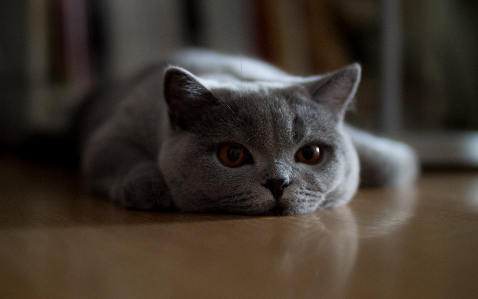 Description: A cat laying on the floor looking at the camera with a blurry background of bookshelves in the background.