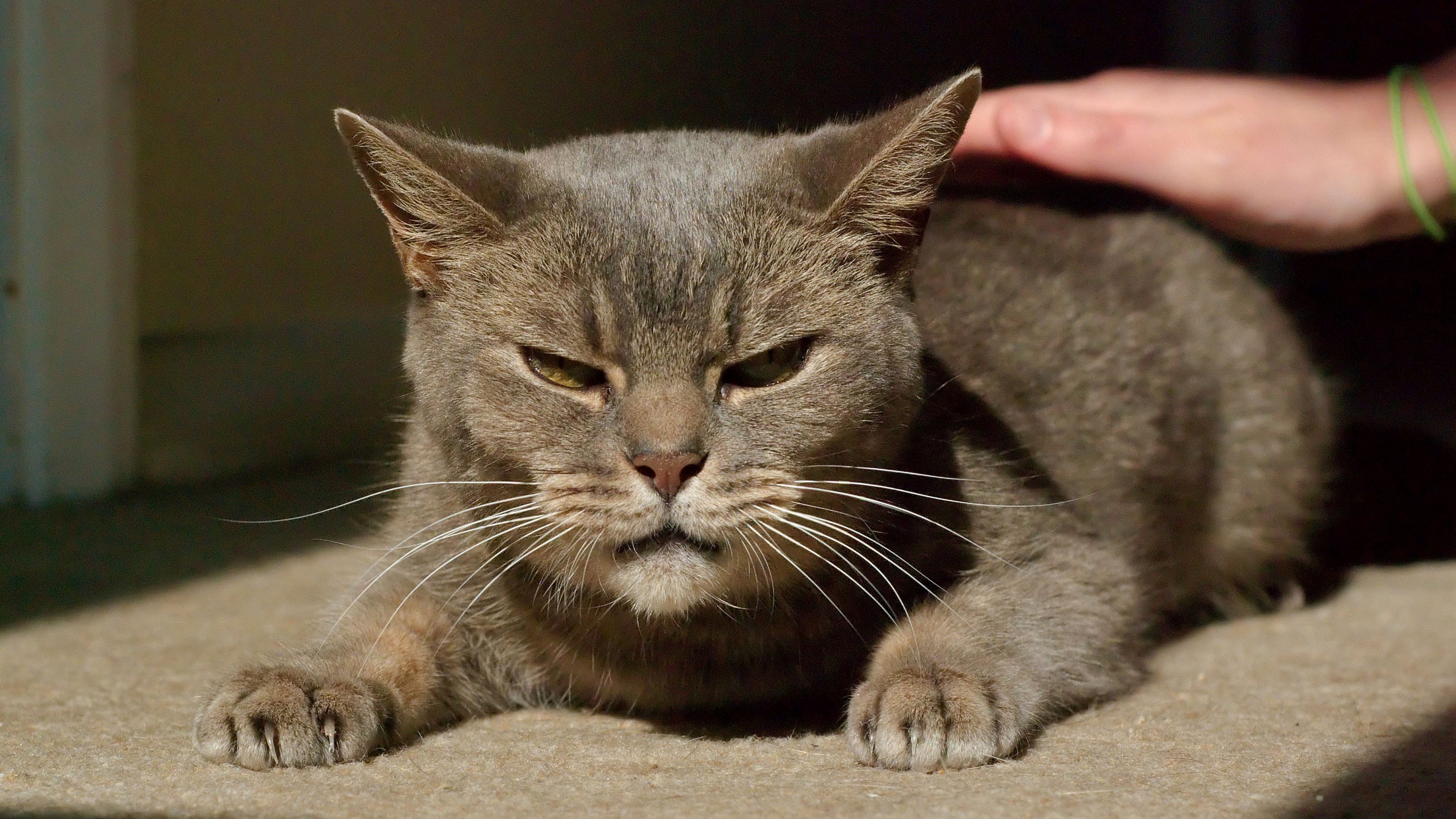 Description: A cat is sitting on the floor and looking at the camera person is holding it up to its face.
