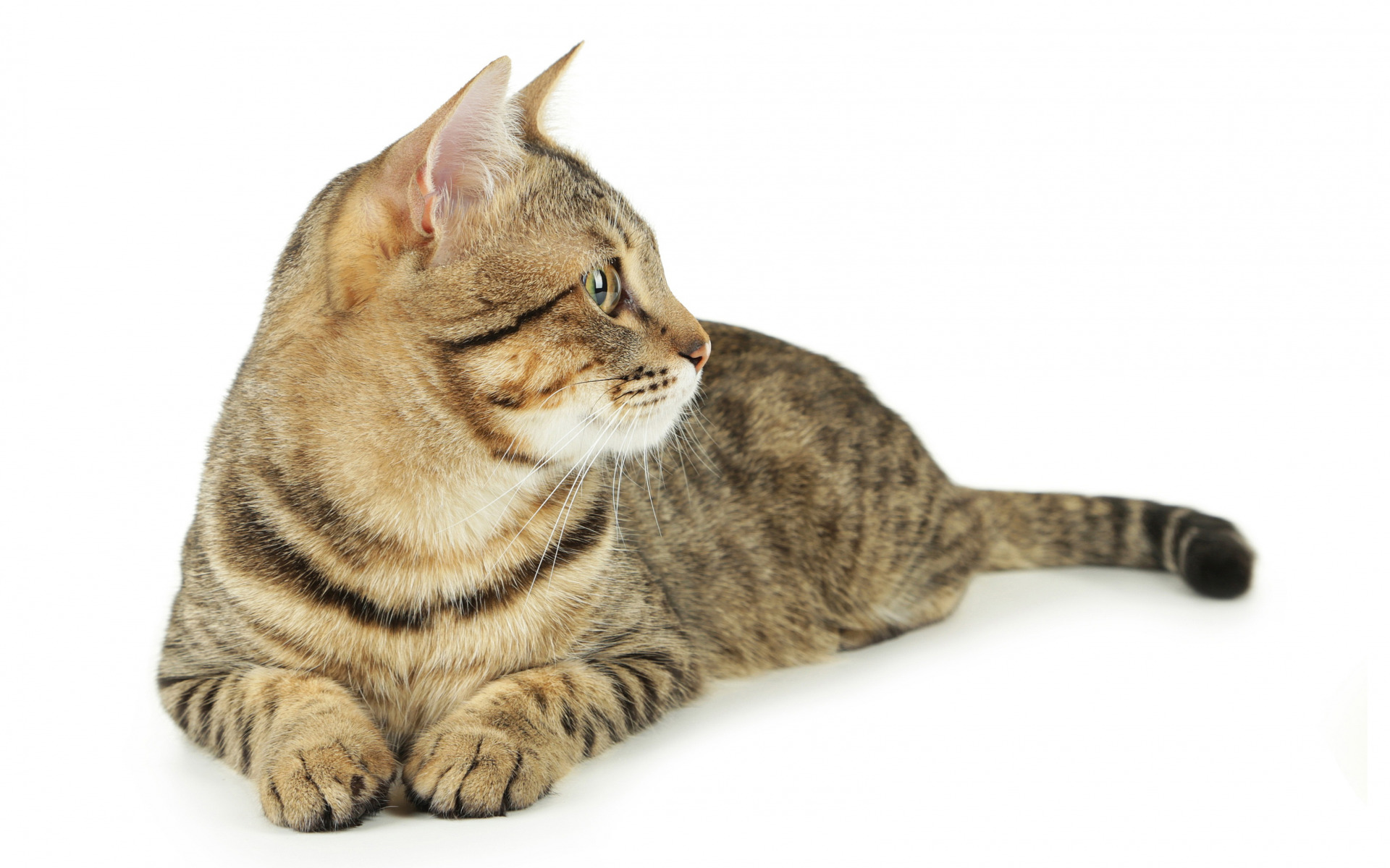 Description: A cat sitting on the ground looking at something in the distance with a white background and a black and brown stripe.