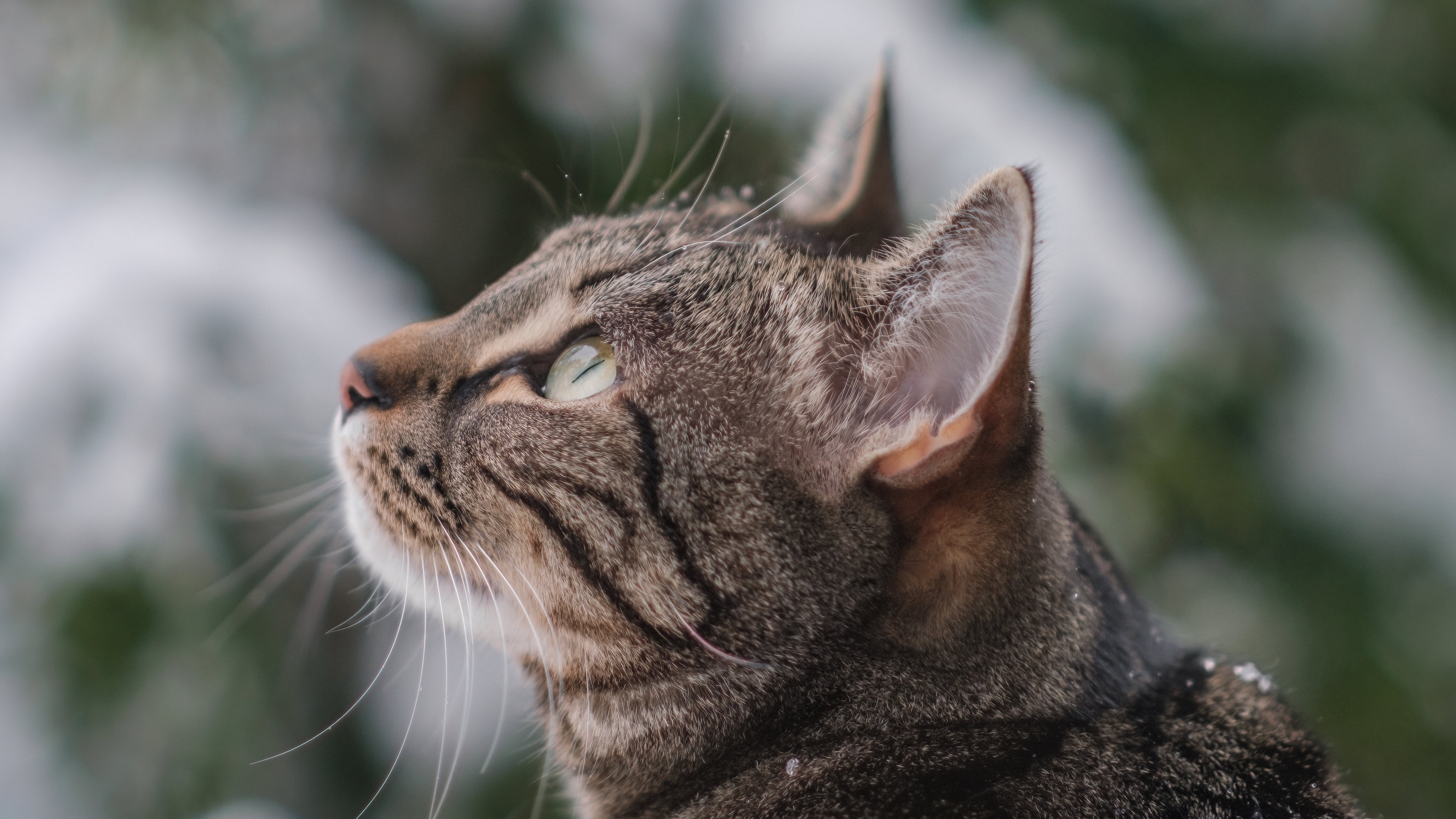 Description: A cat looking up at the sky with snow on the ground behind it and trees in the background with snow on the ground.