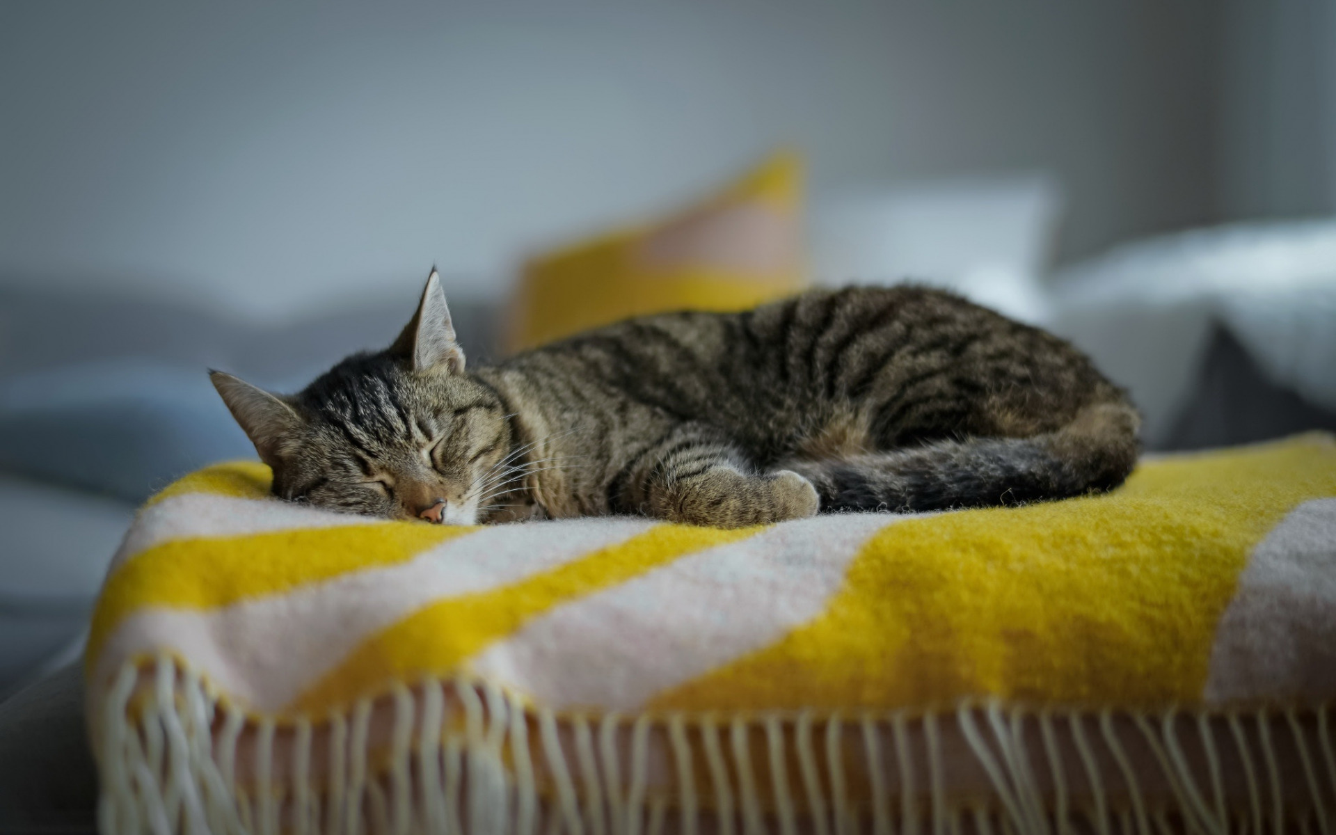 Description: A cat is sleeping on a blanket on a bed with pillows and blankets on it's sides and a yellow and white blanket.