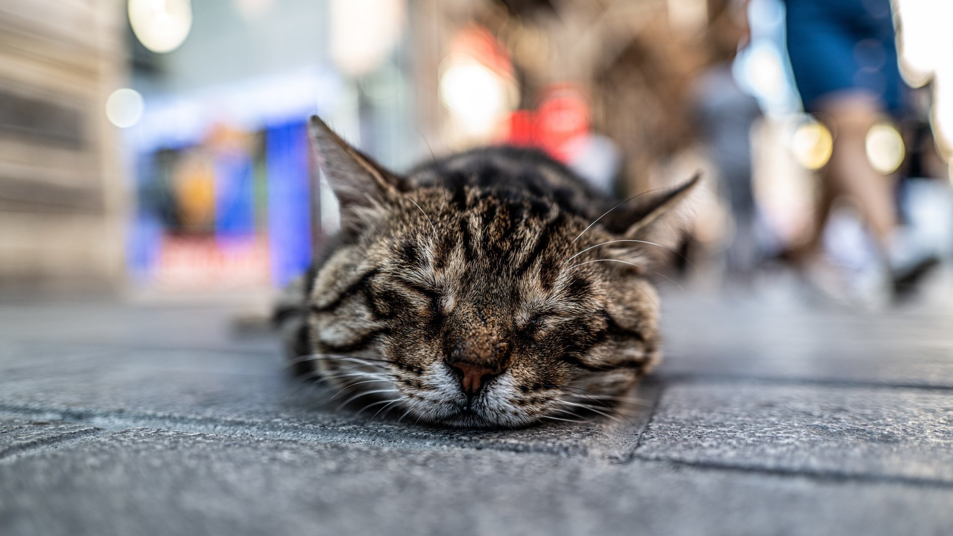 Description: A cat sleeping on the ground in a city street with people walking by in the background and a person walking on the sidewalk.