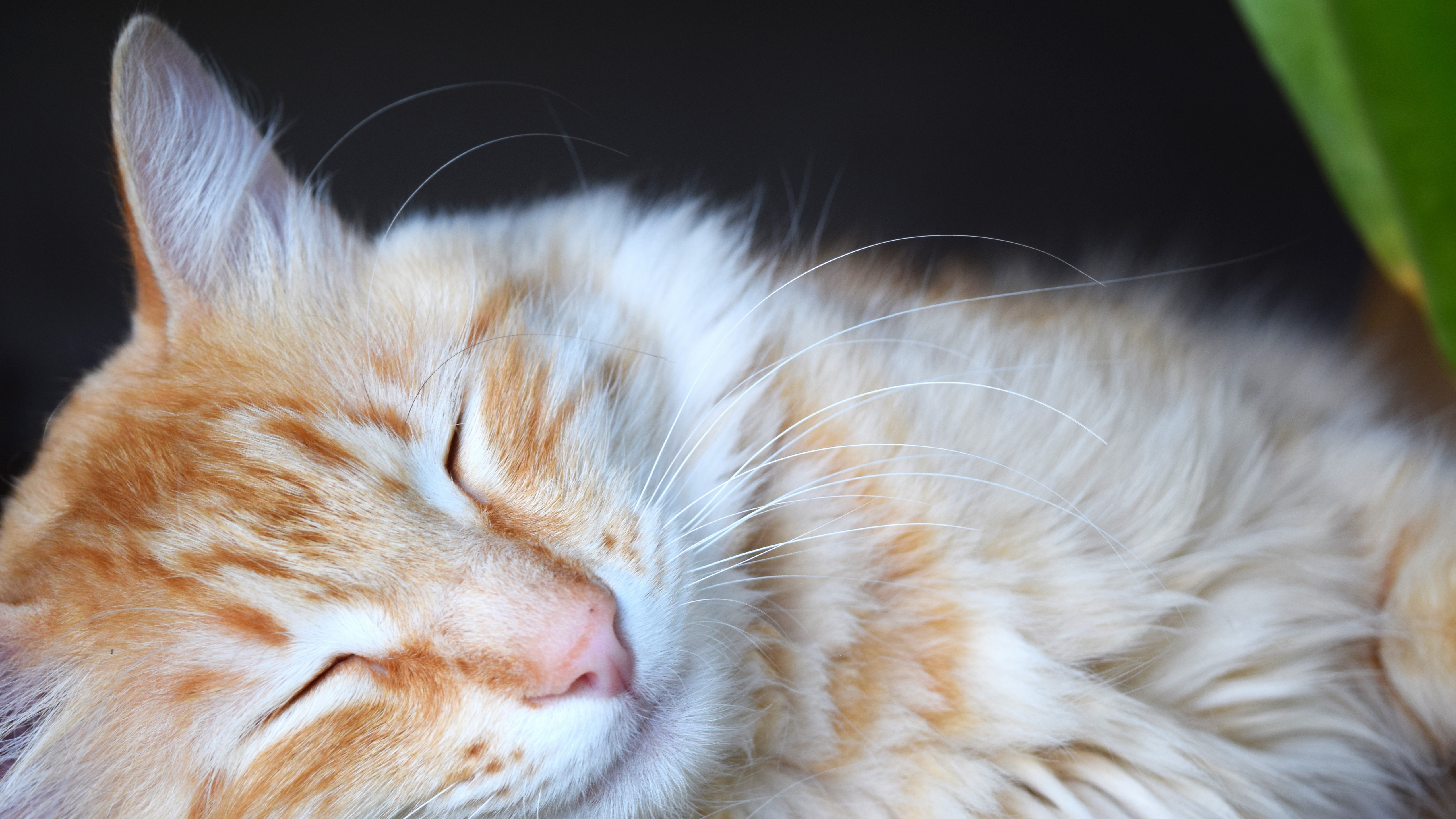Description: A cat sleeping on a table next to a plant with its eyes closed and eyes closed.