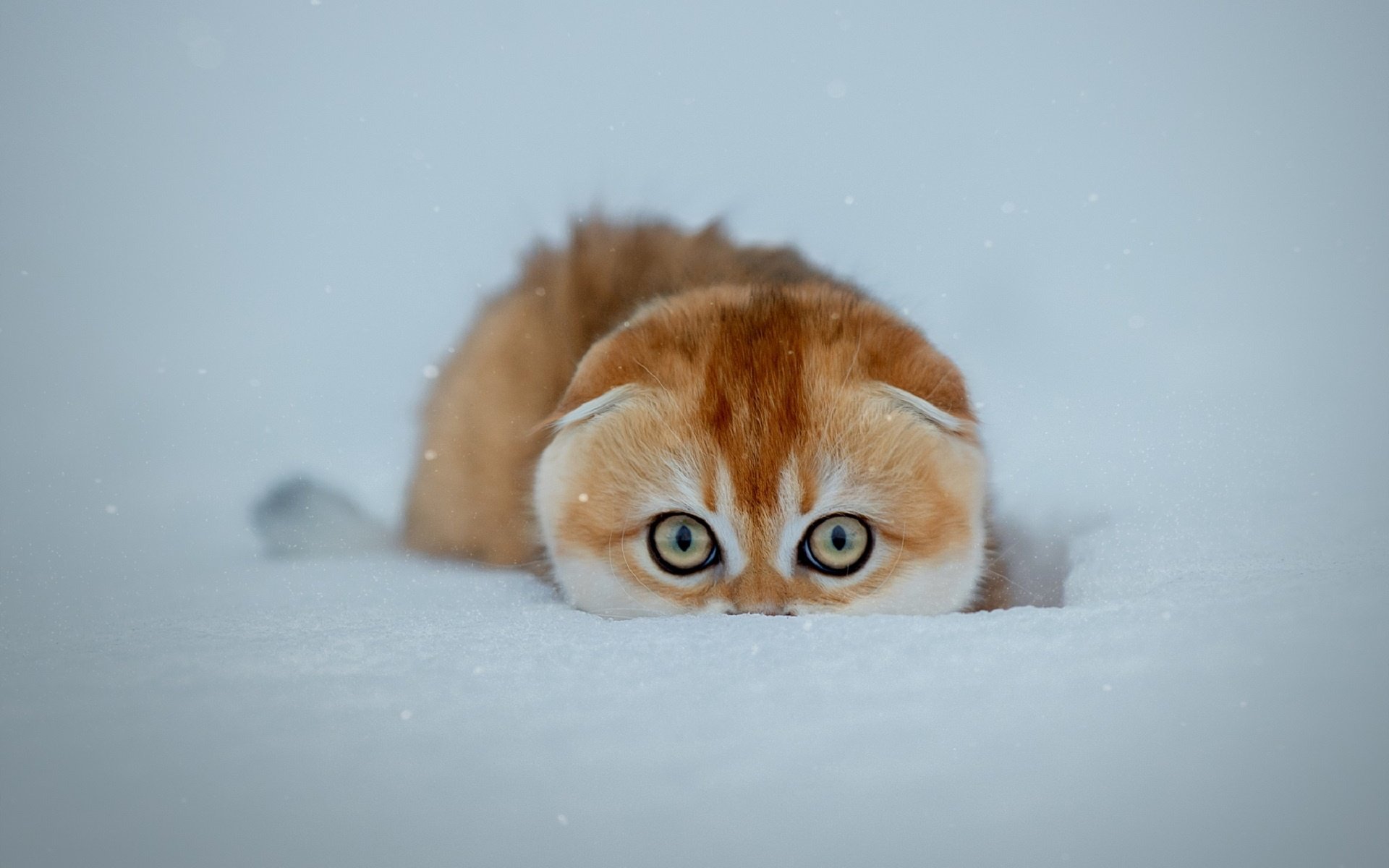 Description: A cat laying down in the snow looking at the camera with a surprised look on its face and eyes.