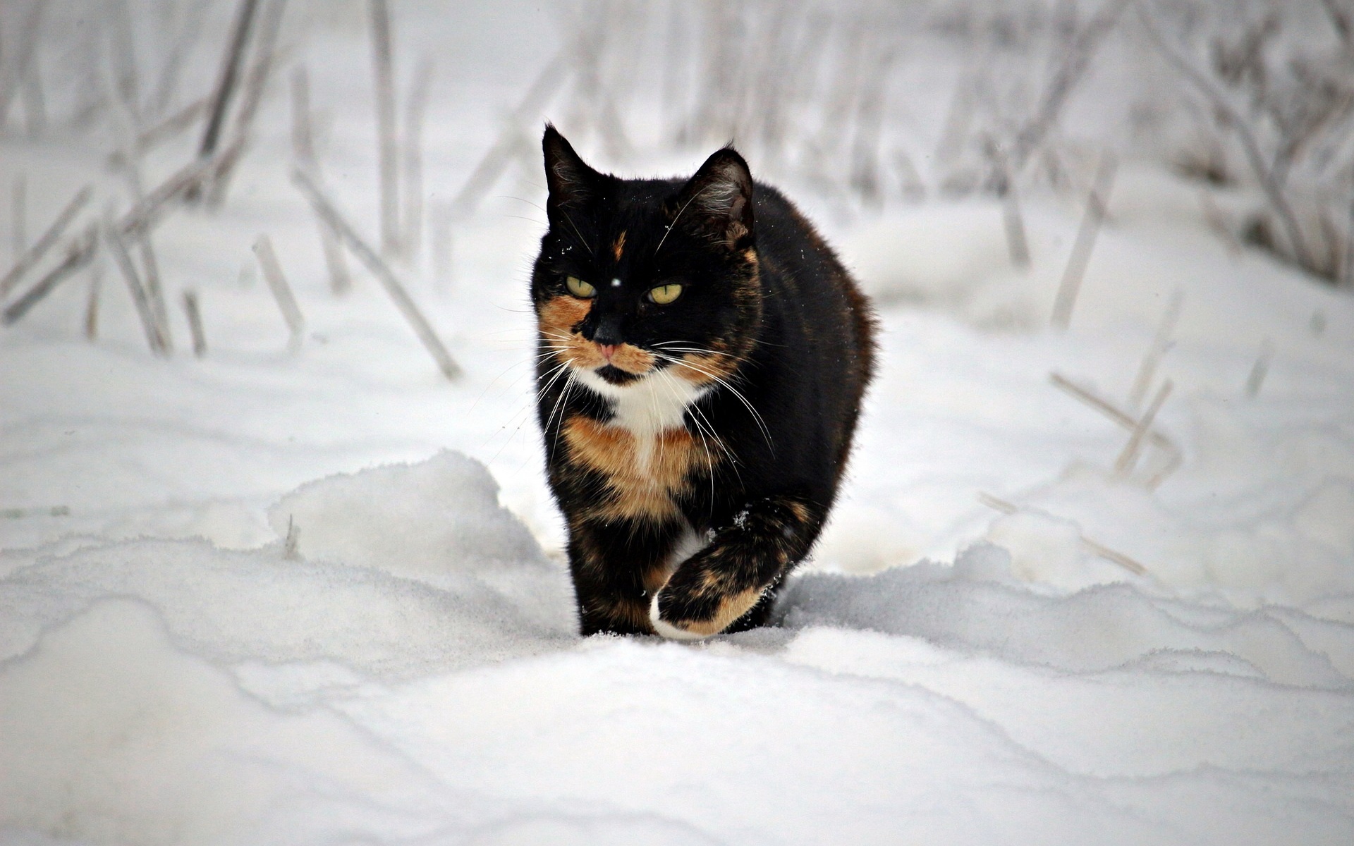 Description: A cat walking through the snow in the woods on a sunny day with no one around it.