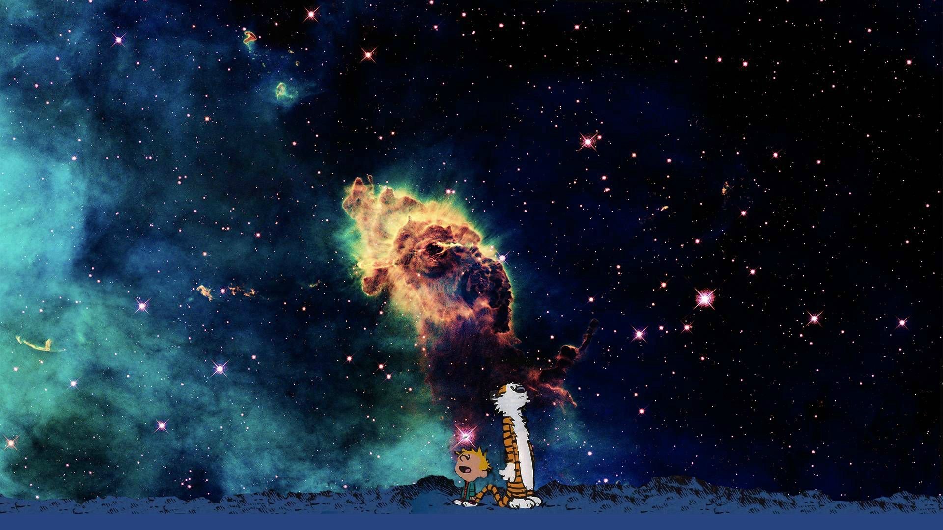 Description: A painting of a cat in the middle of a space with stars and a blue background with a star cluster.