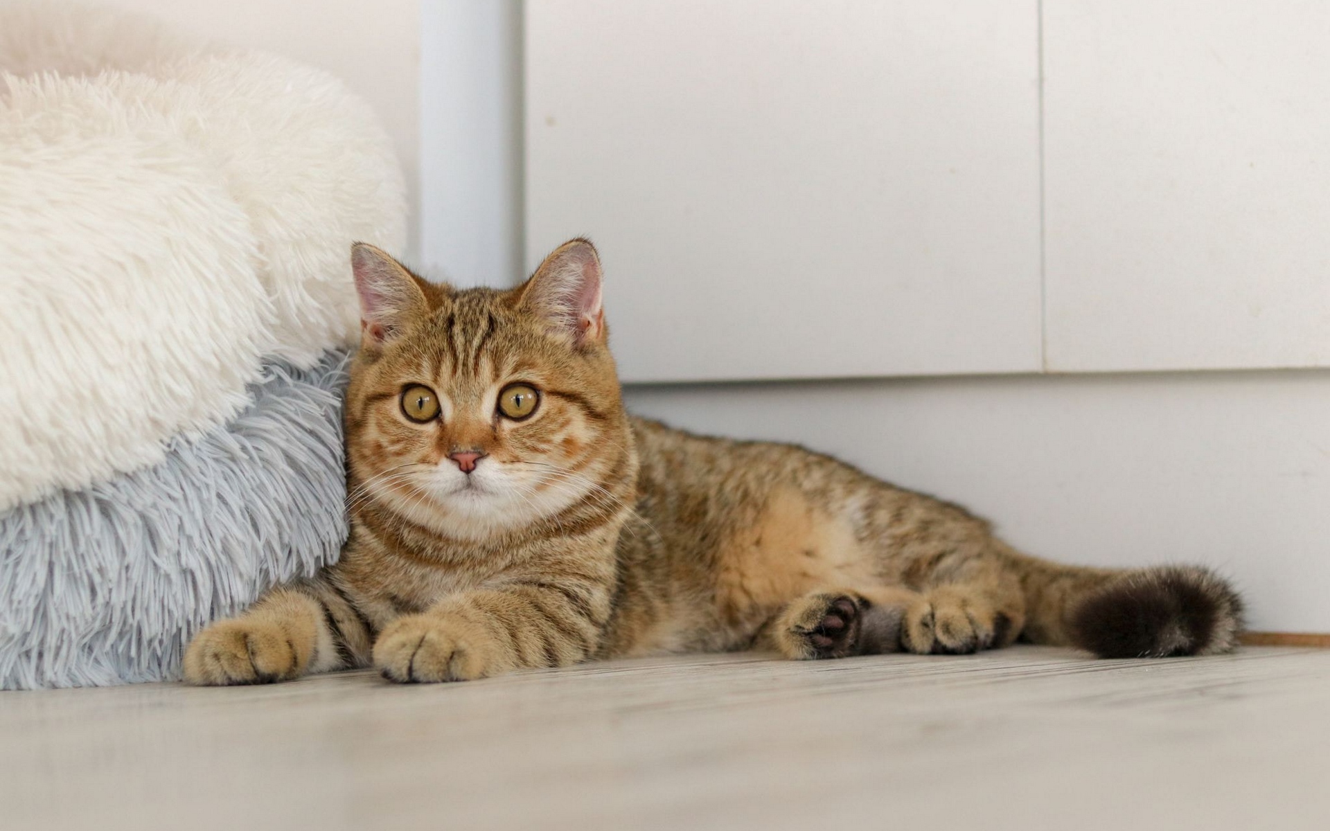 Description: A cat laying on the floor next to a stuffed animal toy and a door way behind it with a white door.