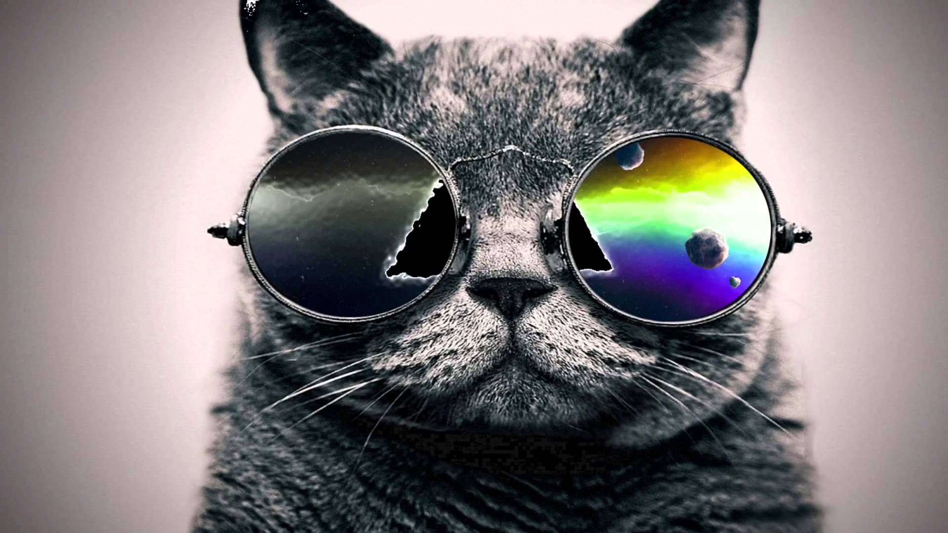 Description: A cat wearing sunglasses with a rainbow reflection in it's eyes and a black and white background with a rainbow reflection in the lens.