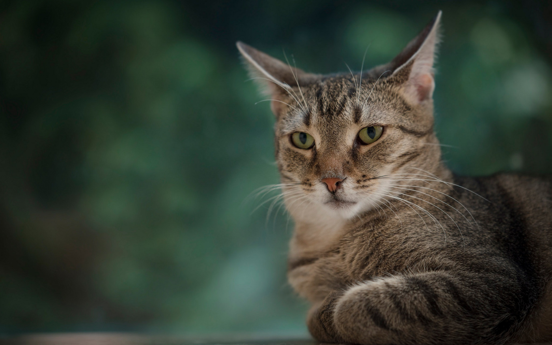 Description: A cat sitting on a table looking at the camera with a blurry background of trees in the background.