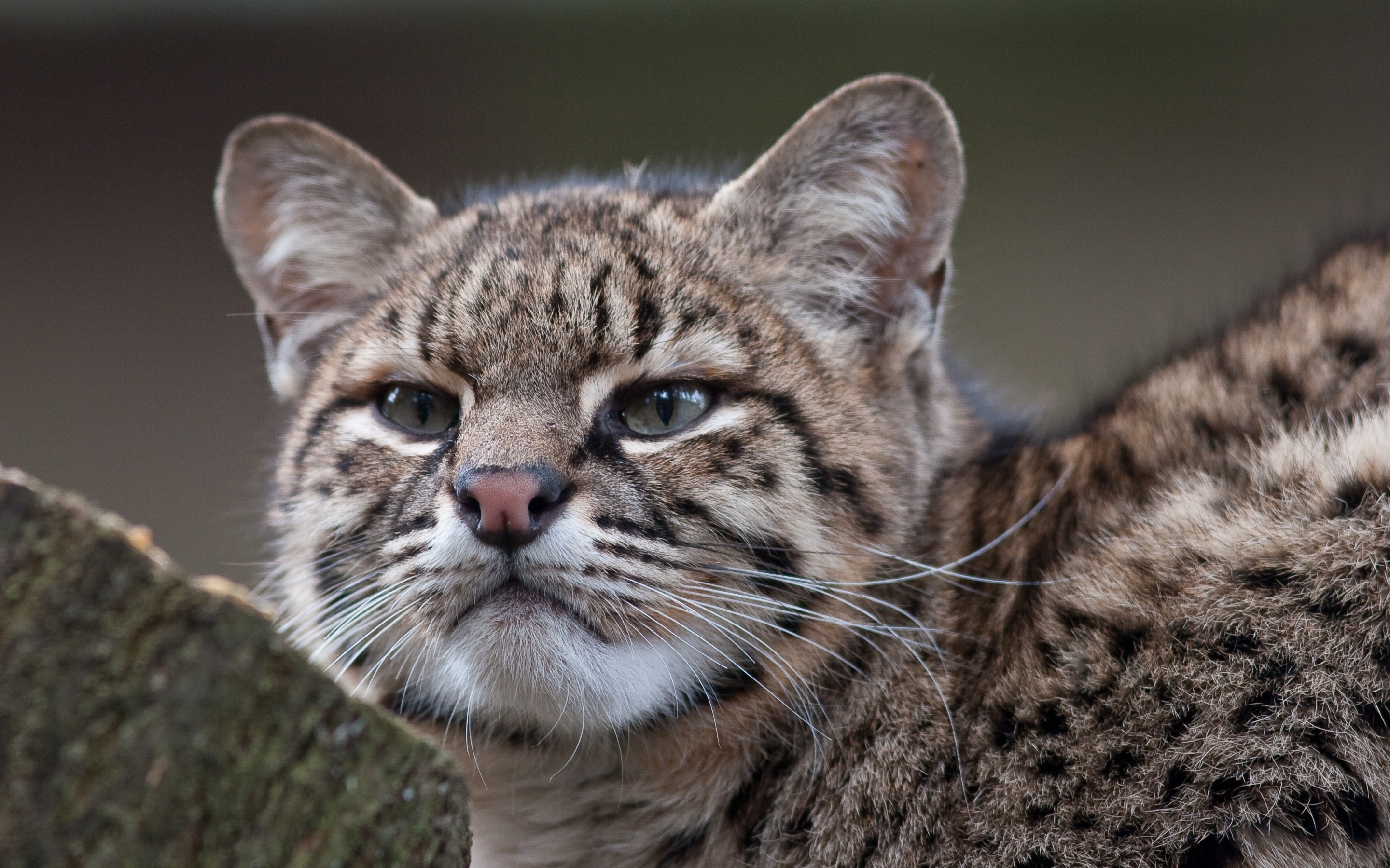 Description: A close up of a cat with a blurry background and a tree trunk in the foreground with a blurry background.