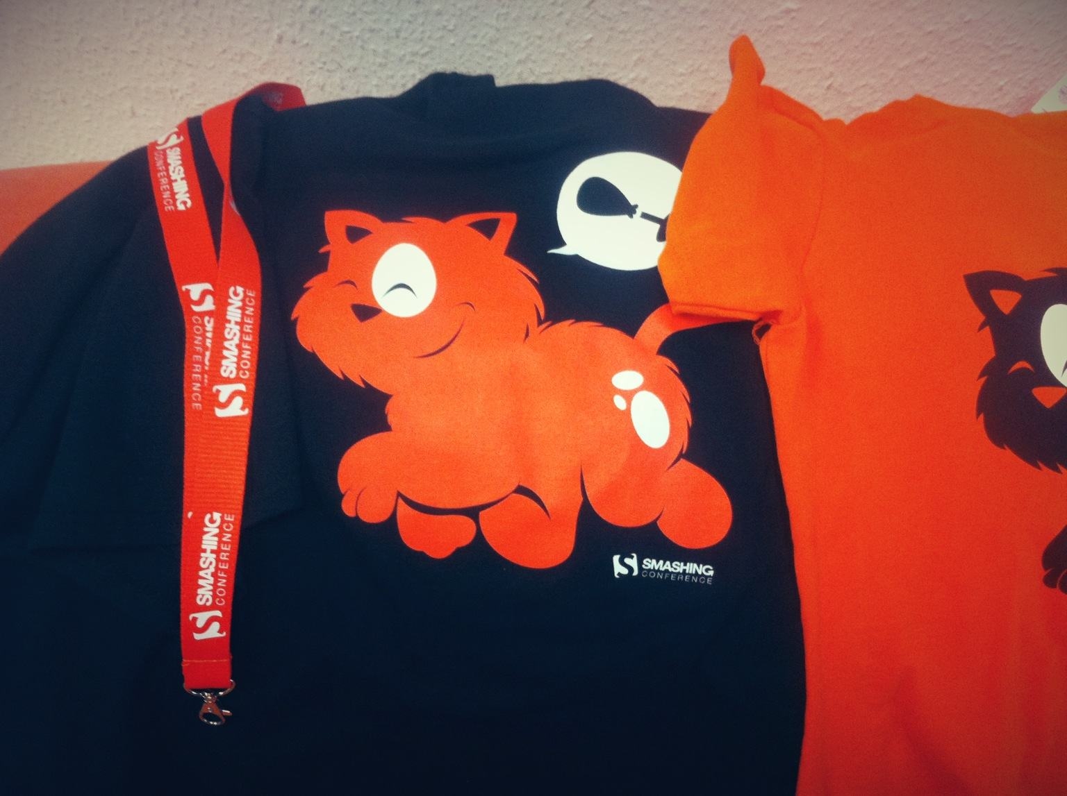 Description: A group of t - shirts with a cat on them on a bed with a wall in the background.