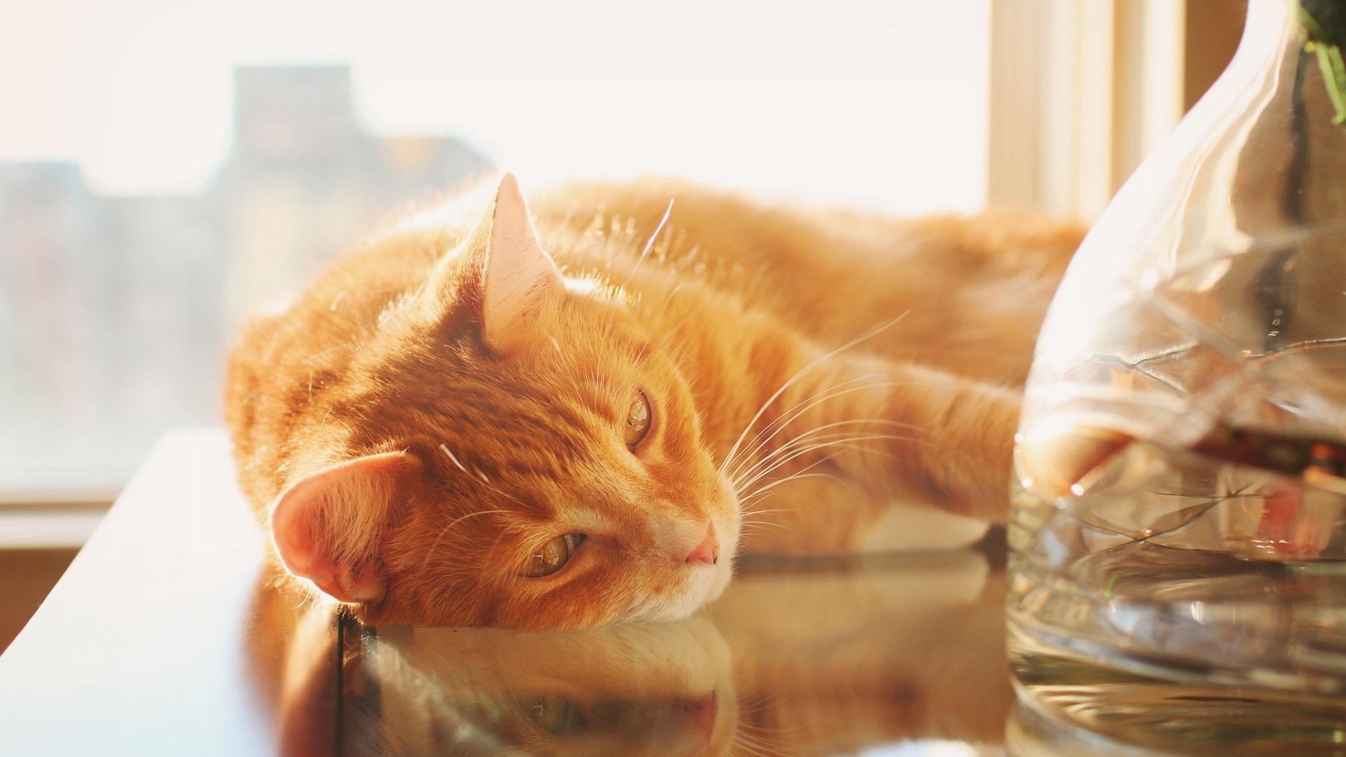 Description: A cat laying on a table next to a vase with flowers in it and a window behind it with a city view.