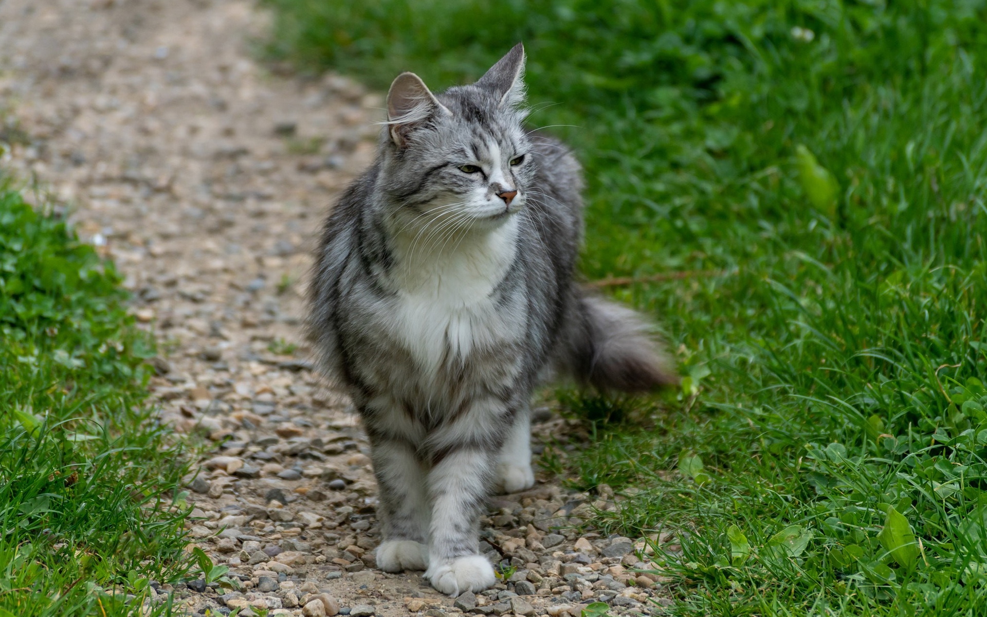 Description: A cat walking down a gravel road next to grass and flowers on a sunny day with a blurry background.