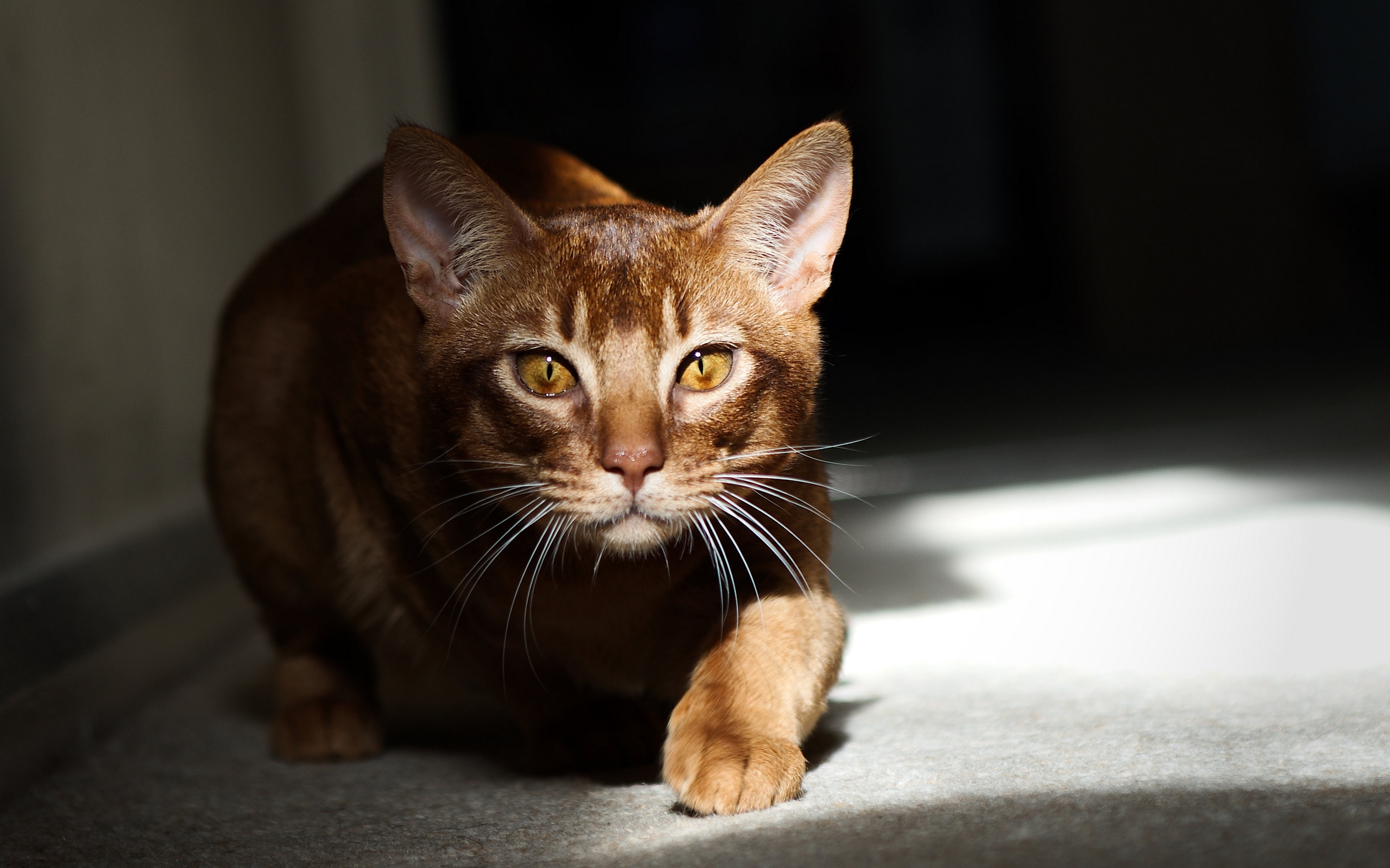 Description: A cat is walking on the floor in the sunlight with its paw on the floor and eyes wide open.