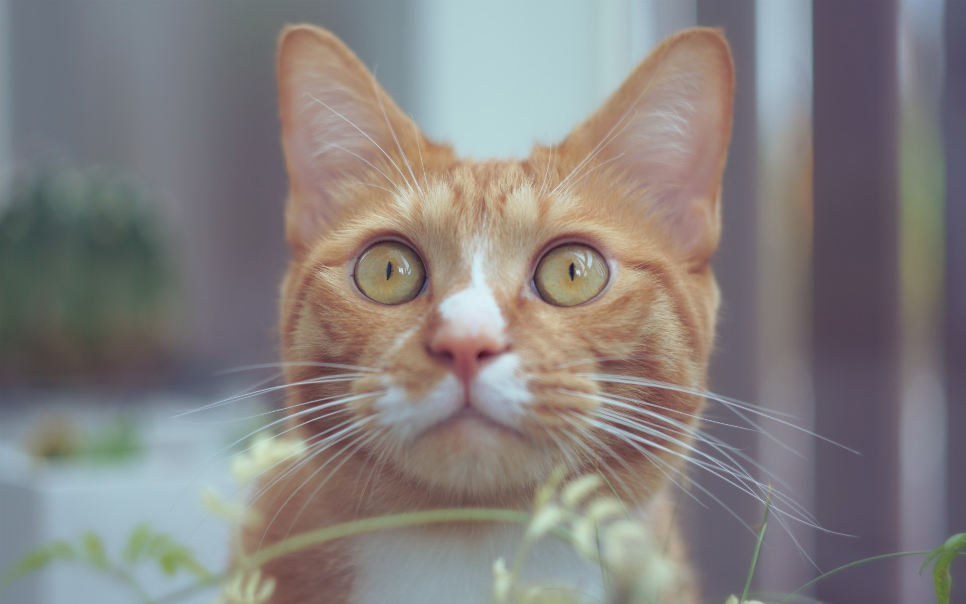 Description: A cat with a white nose and yellow eyes looking at the camera with a plant in the background and a potted plant in the foreground.