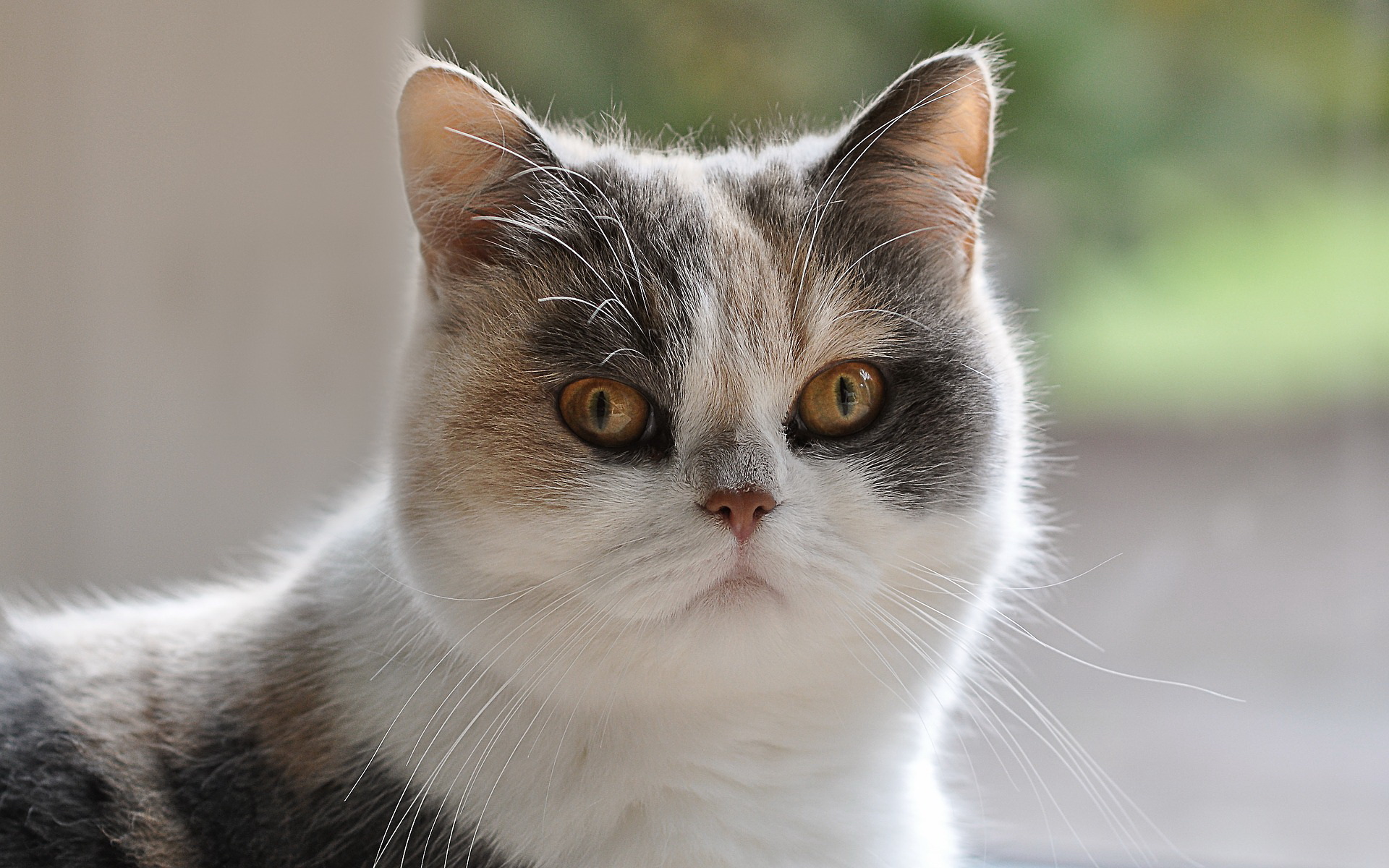 Description: A cat with a white face and brown eyes looking at the camera with a blurry background of trees.