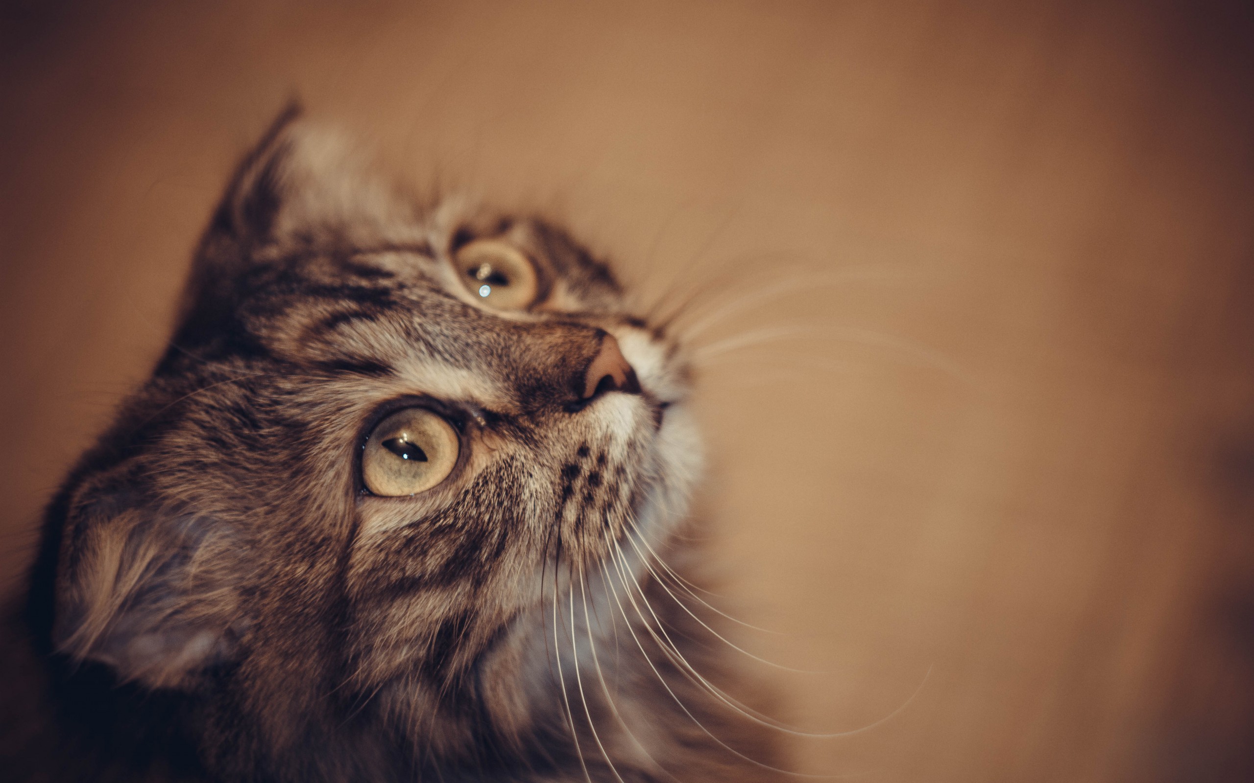 Description: A cat looking up with its eyes wide open and a brown background is in the background with a white stripe.
