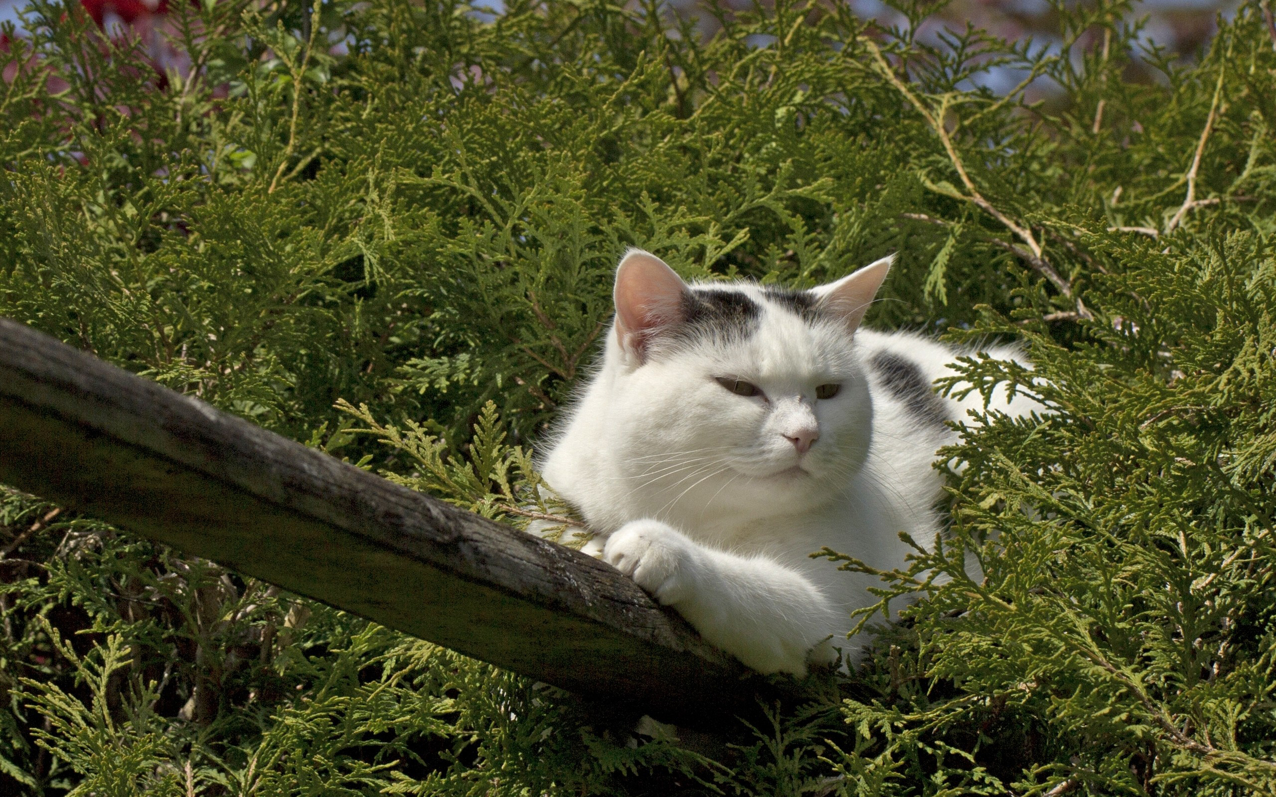 Description: A cat sitting on a wooden rail in a bushy area with green plants and a blue sky in the background.
