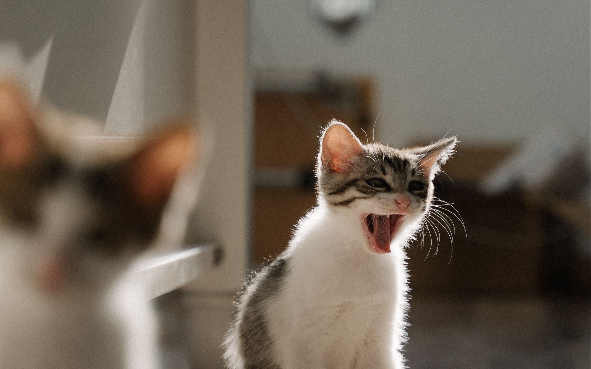 Description: A cat yawns while standing in front of a mirror with its mouth open and it's tongue out.