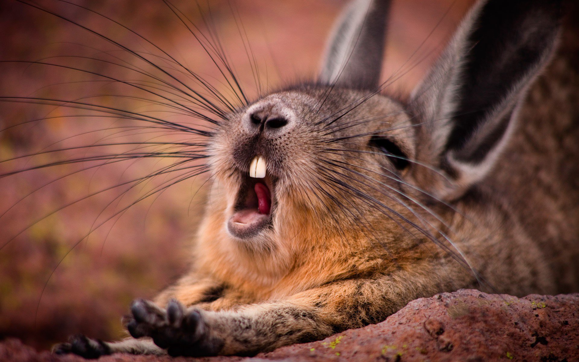 Description: A cat yawns while laying on a rock with its mouth open and it's tongue out.
