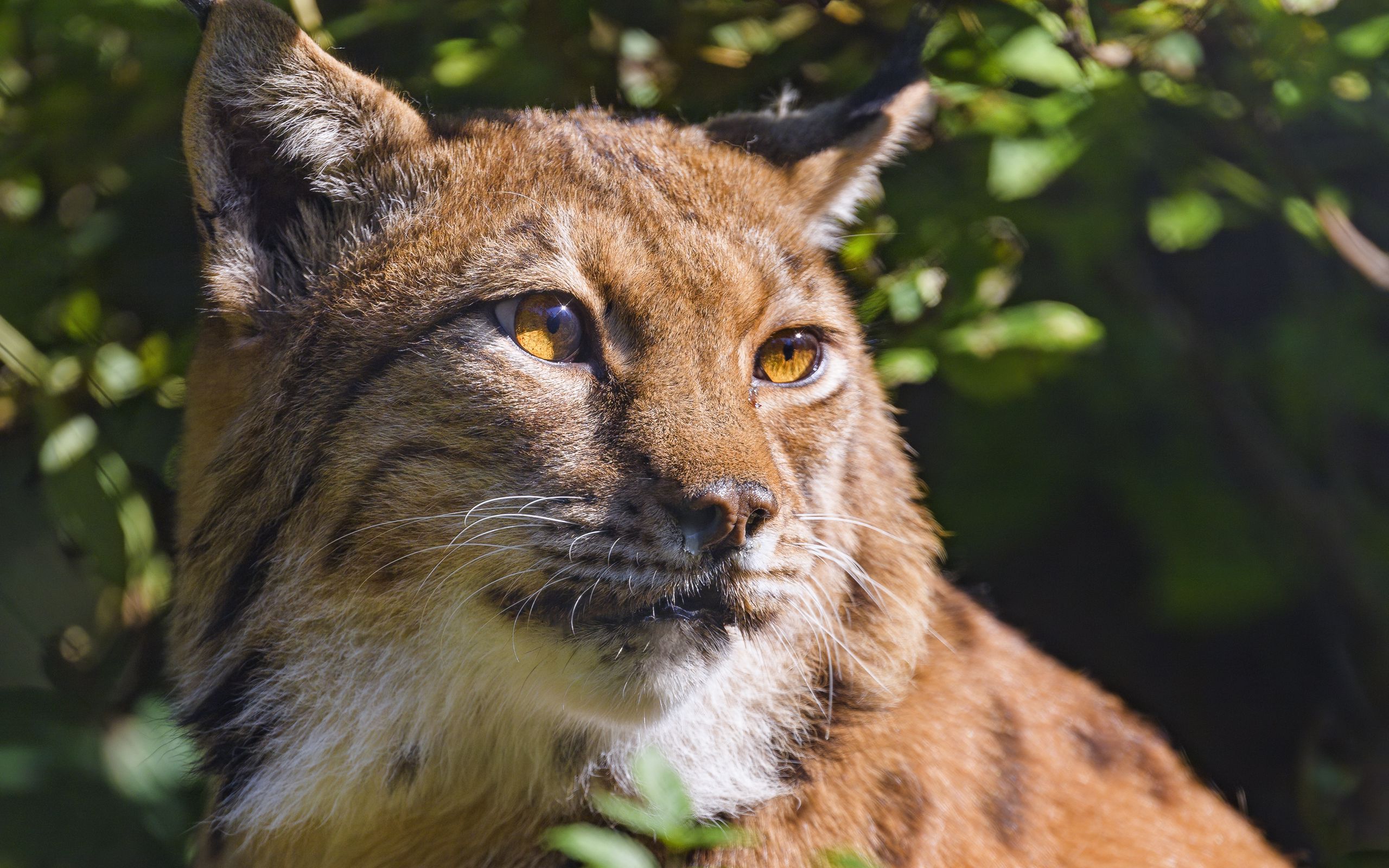 Description: A close up of a cat with a bush in the background and trees in the foreground.