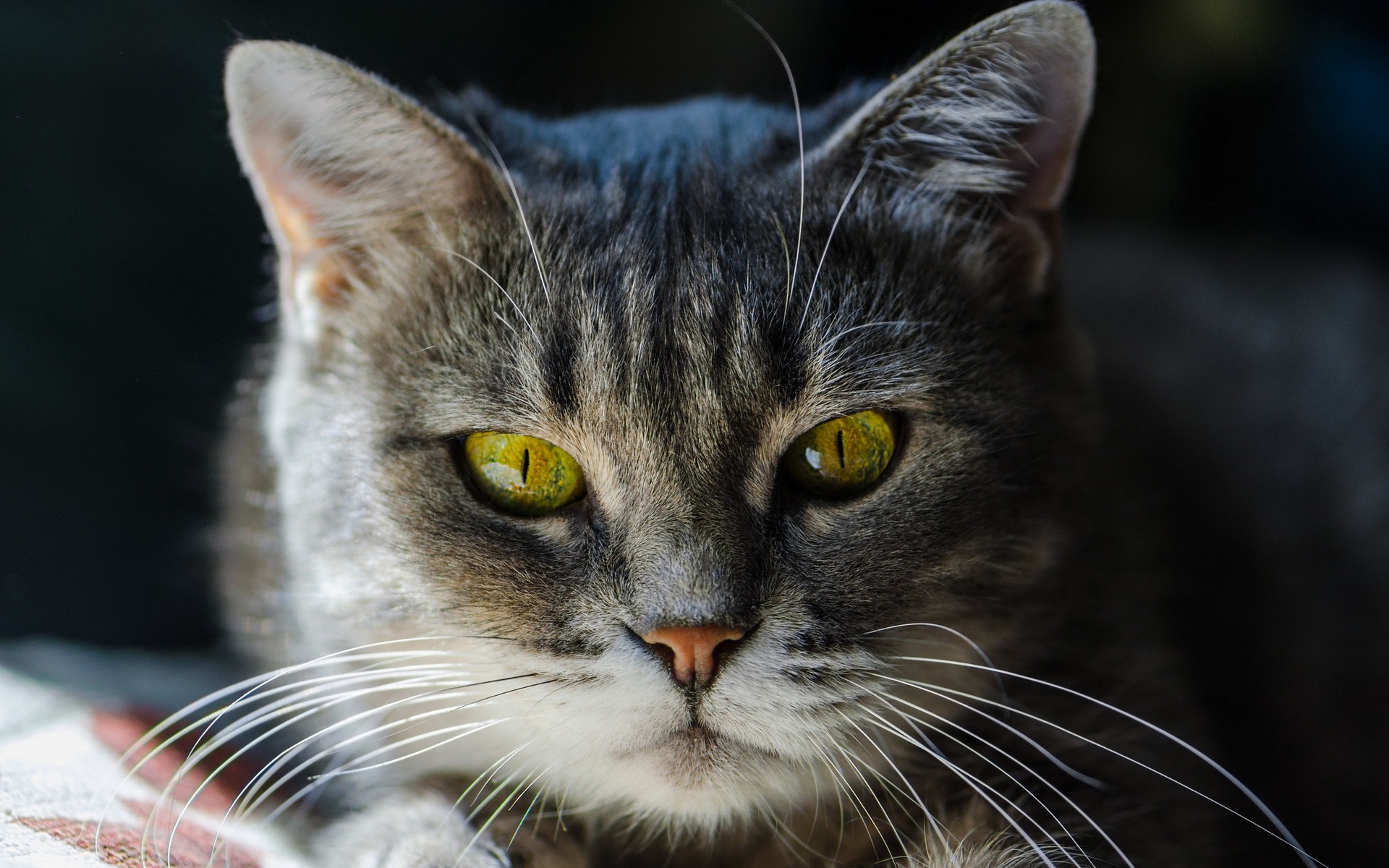 Description: A cat with yellow eyes laying on a blanket looking at the camera with a sad look on its face.