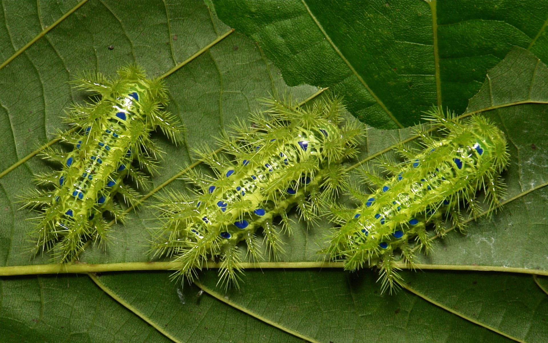 Description: A group of caterpillars sitting on a leaf together on a branch in the forest.