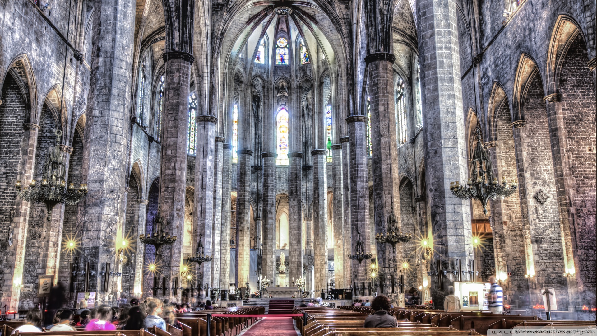Description: A large cathedral with a lot of pews and people sitting at the alters and looking at the ceiling.