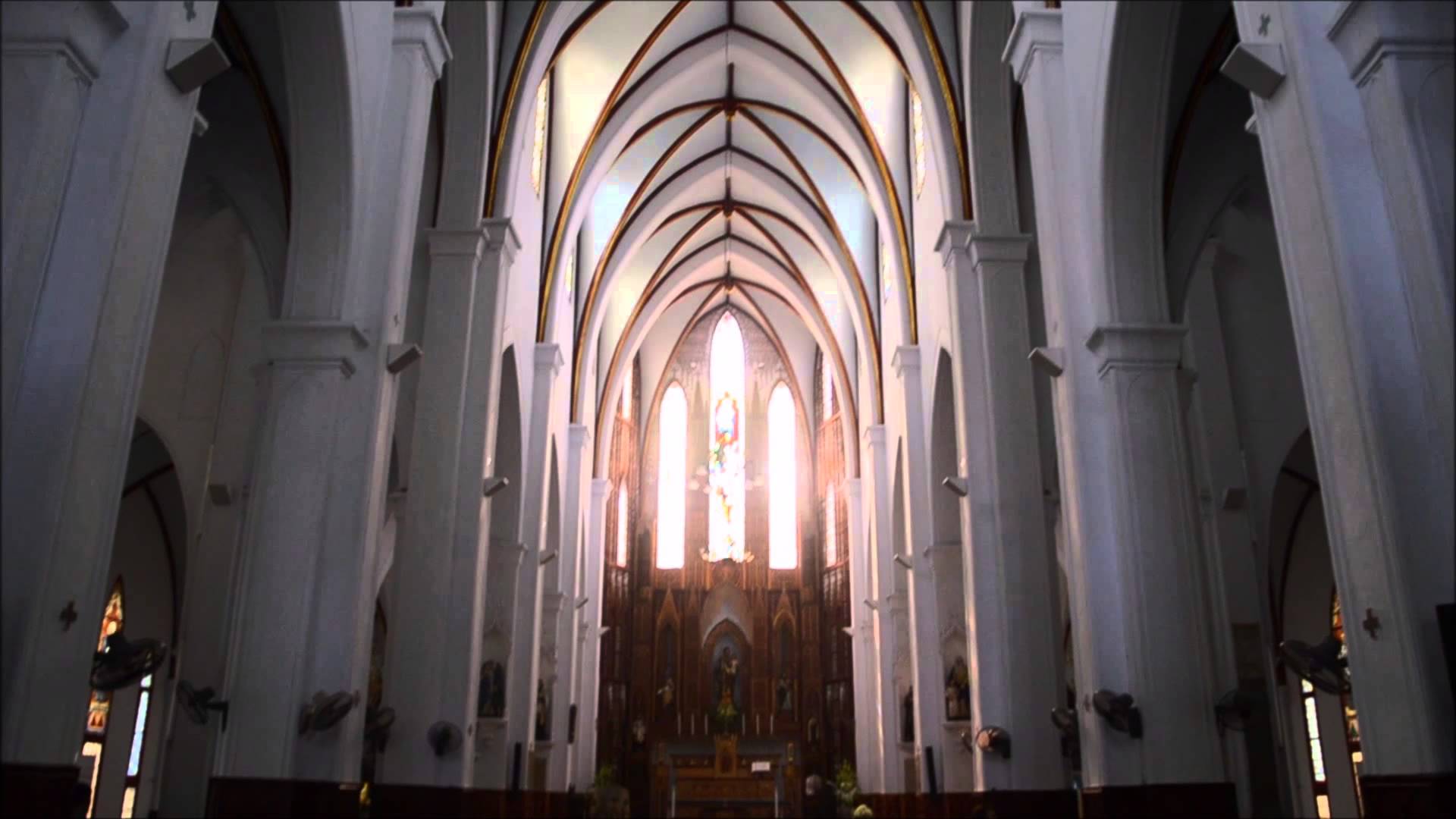Description: A cathedral with a large amount of windows and a person standing in the aisle of the building with a backpack.