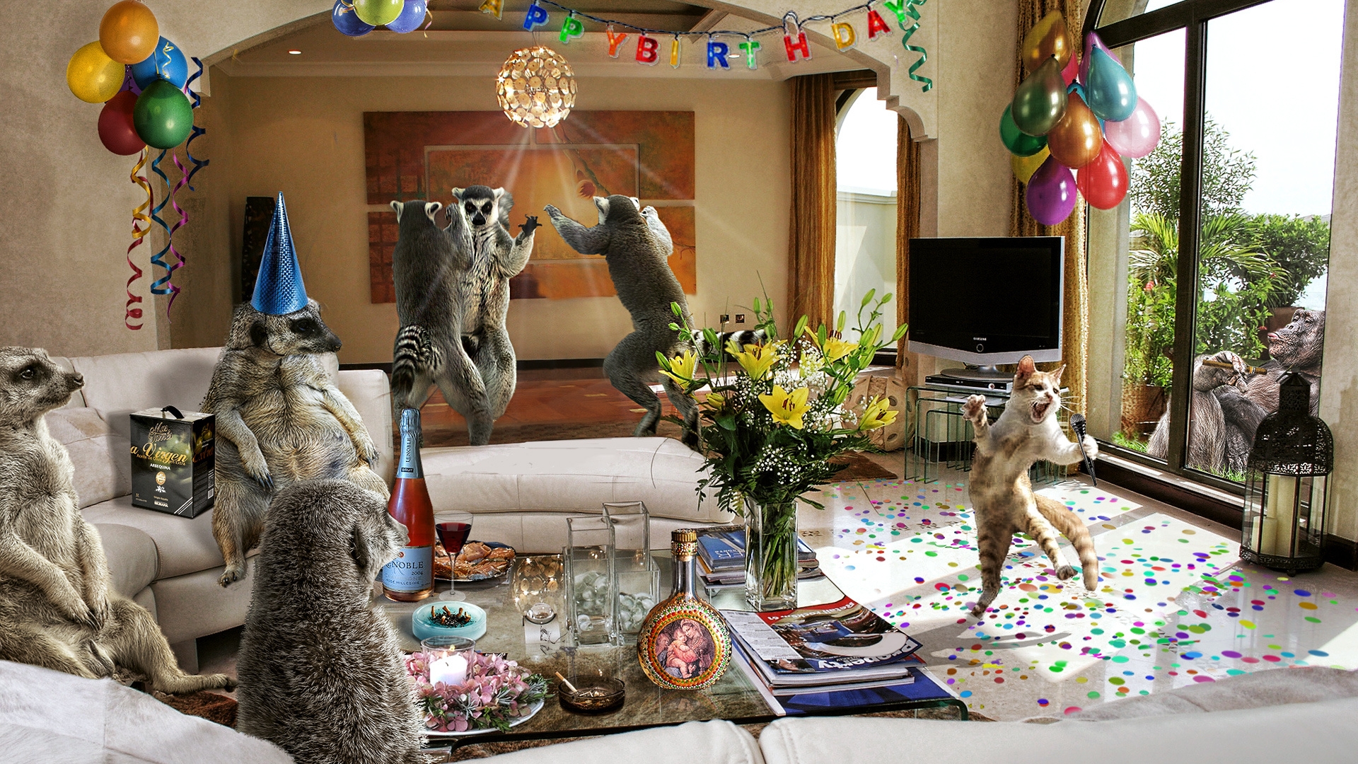 Description: A group of cats sitting on top of a couch in a living room next to a window with balloons.