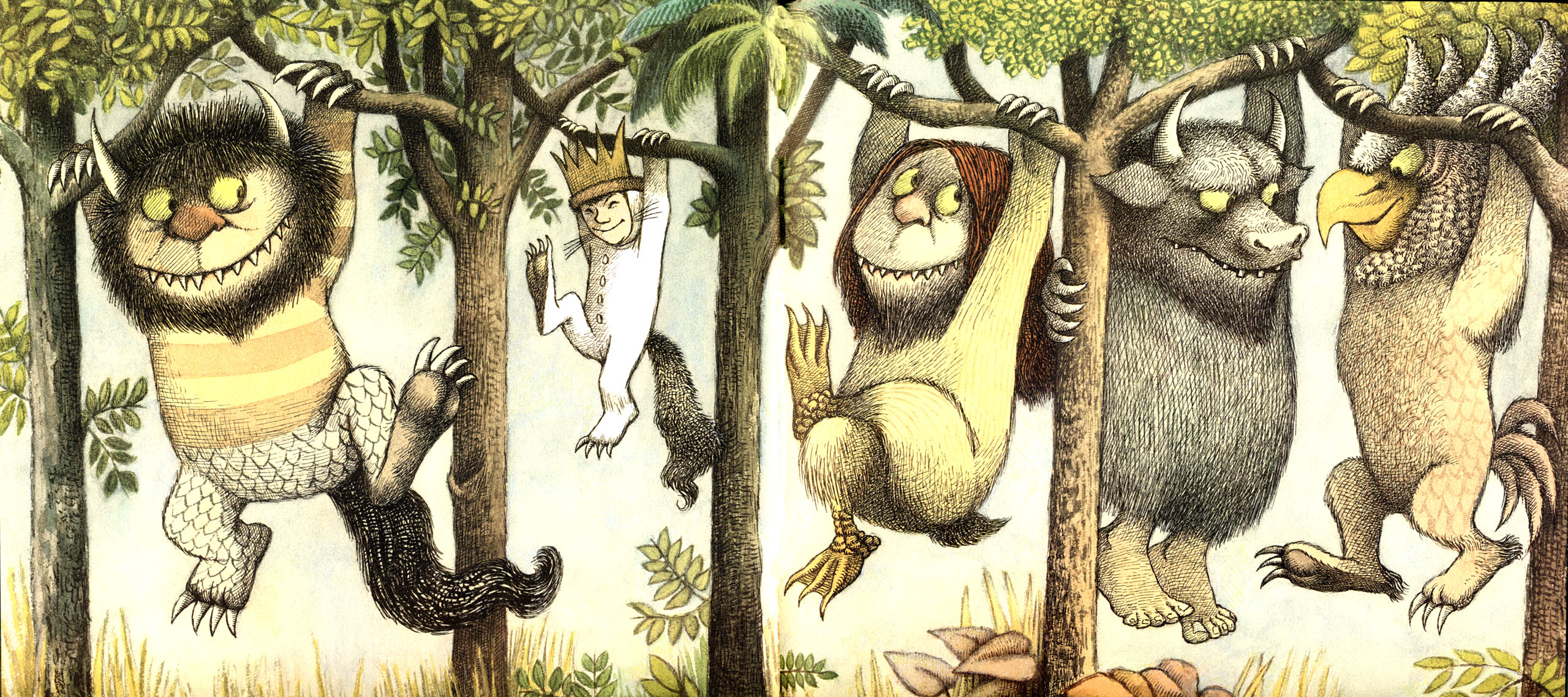 Description: A group of cats hanging from trees in a forest with a turtle and turtle crawling on the ground in front of them.