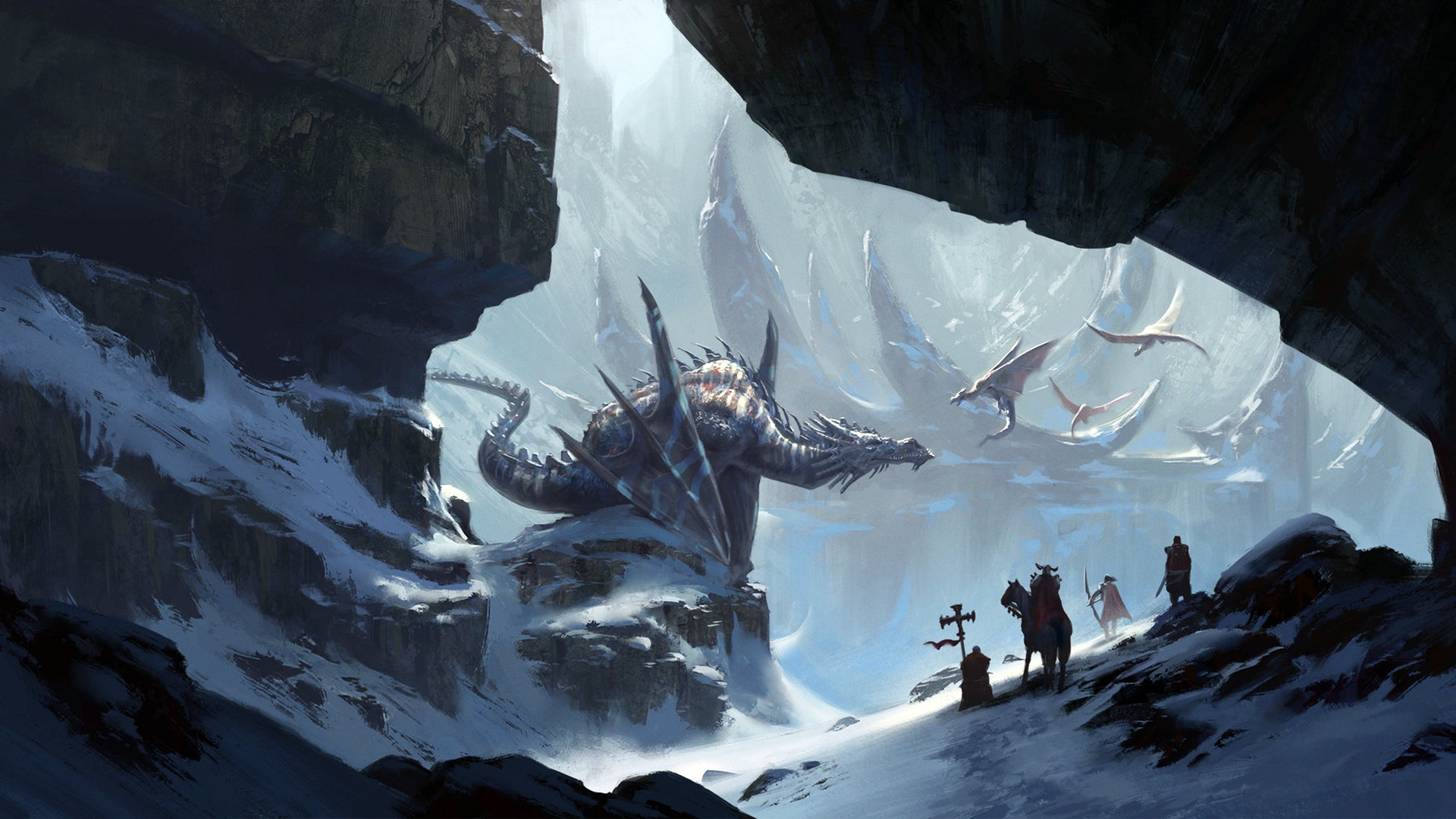 Description: A group of people standing in a cave with a dragon on it's back and a mountain in the background.