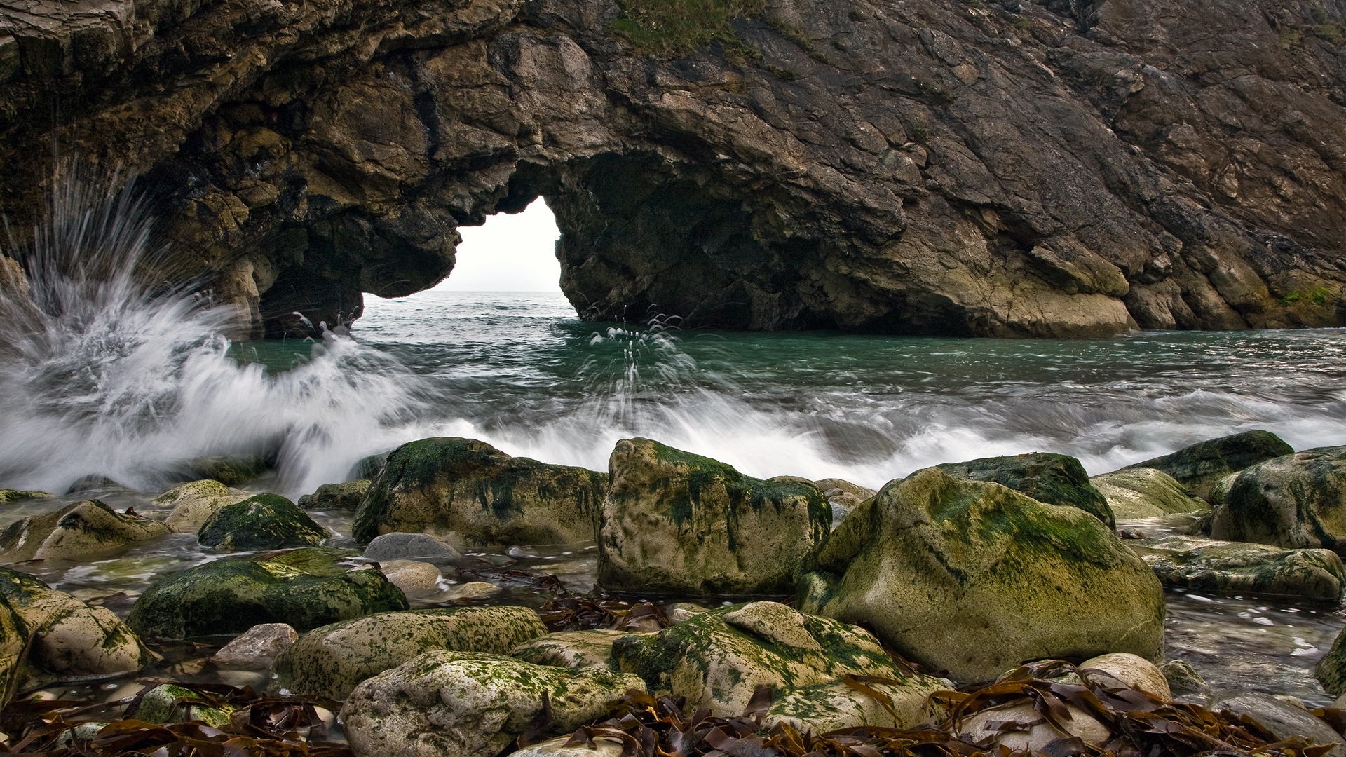 Description: A cave entrance with a wave crashing into the water and rocks in the foreground and a rock outcropping in the background.