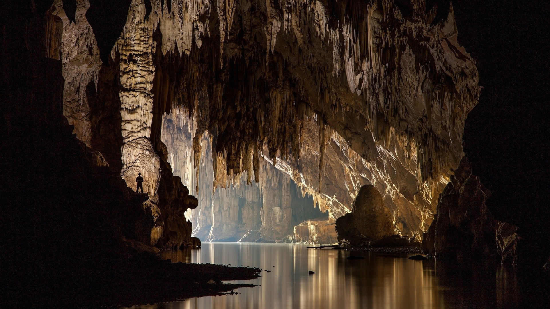 Description: A cave with a lake and a boat in the water at night time with lights on the cave walls.