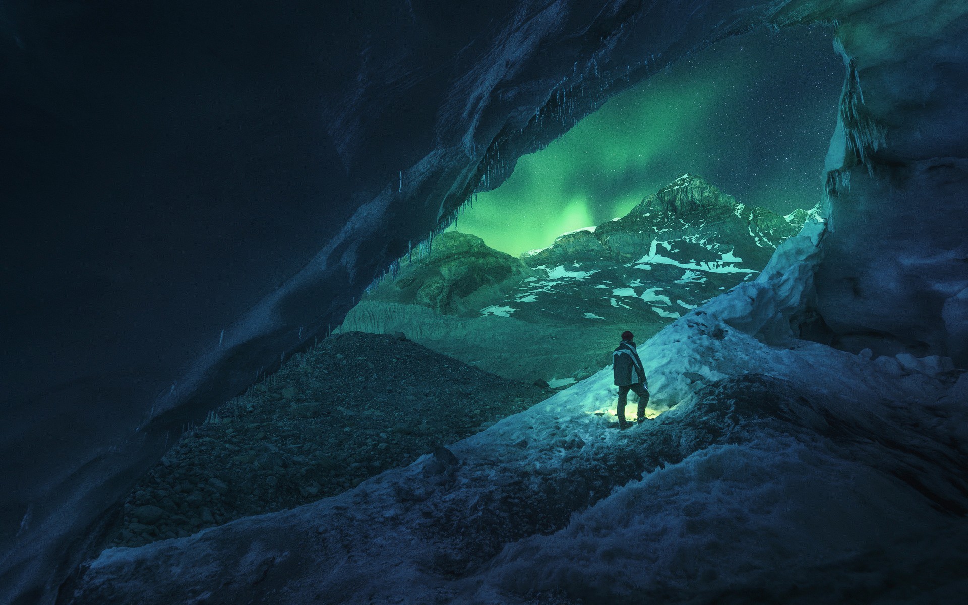 Description: A man standing in a cave looking at the aurora lights in the sky above him and a mountain range in the background.
