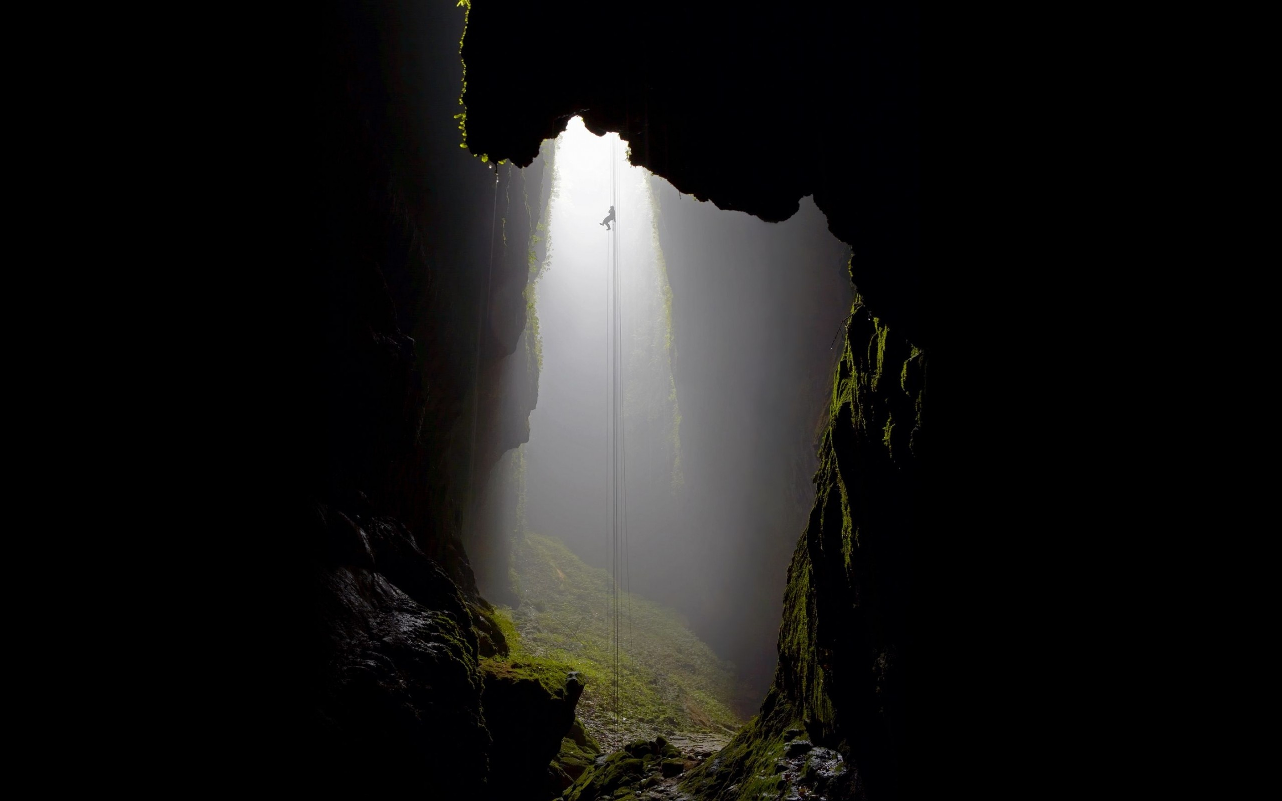 Description: A person walking through a cave with a light coming from the ceiling of it and a foggy sky.