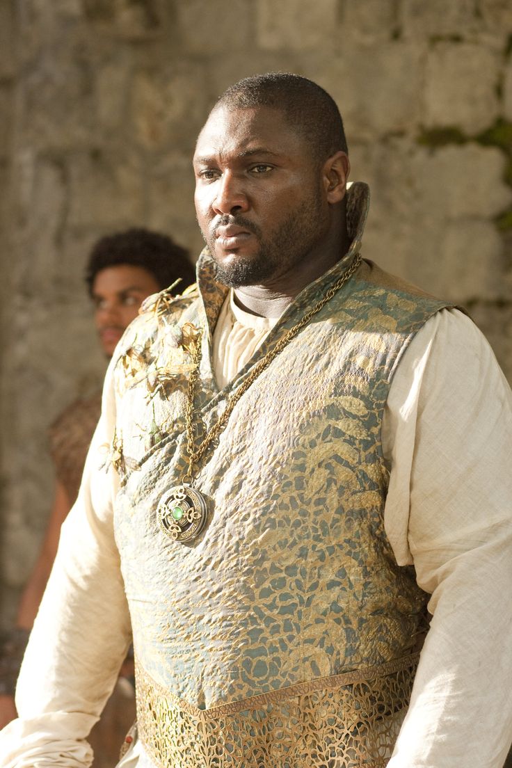 Description: A man in a white and gold outfit standing in front of a stone wall with a man in a white shirt and gold necklace.