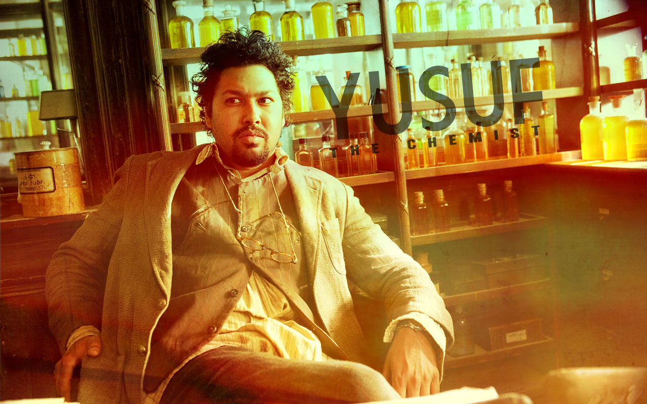 Description: A man sitting in a chair in front of a shelf of bottles and jars of liquors in a store.