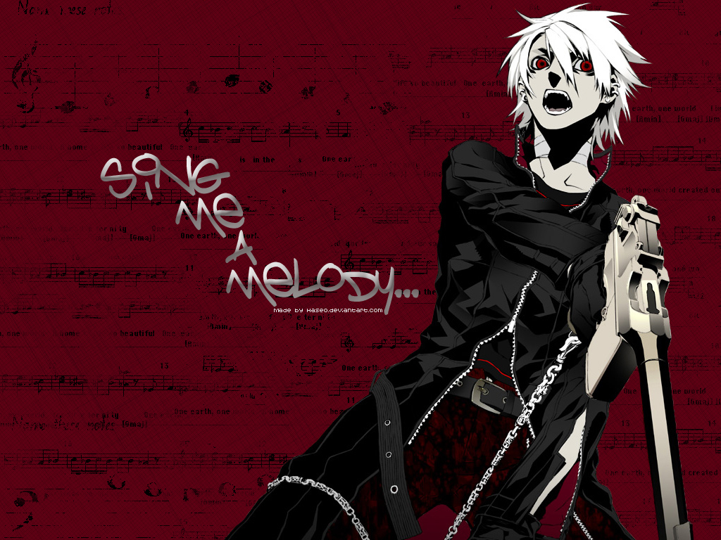 Description: A man with a sword and chains on his arm and a red background with music notes behind him and a red background with a black and white background.