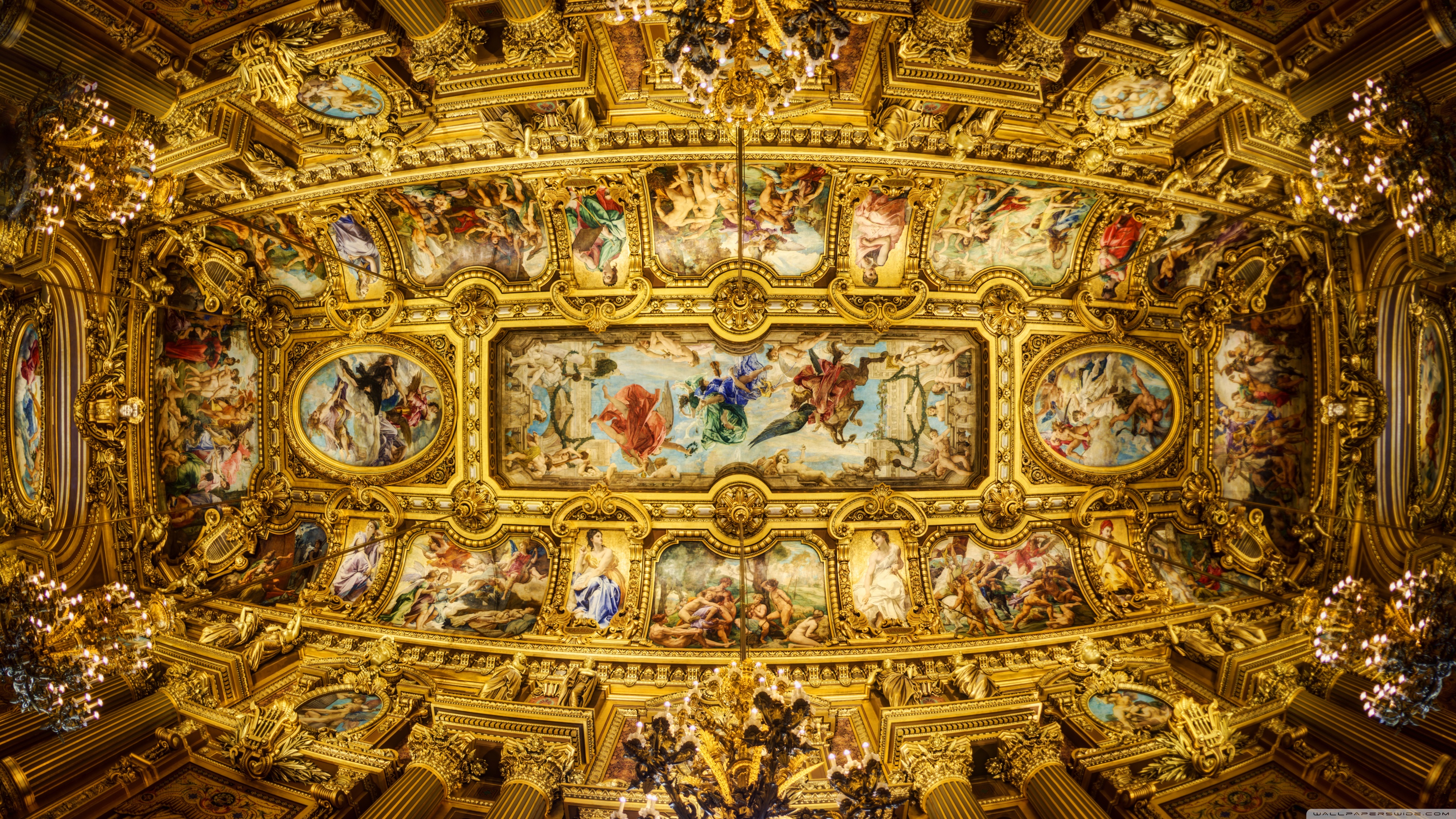 Description: A ceiling with a painting of people and animals on it in a building with gold trimmings and ornate decorations.