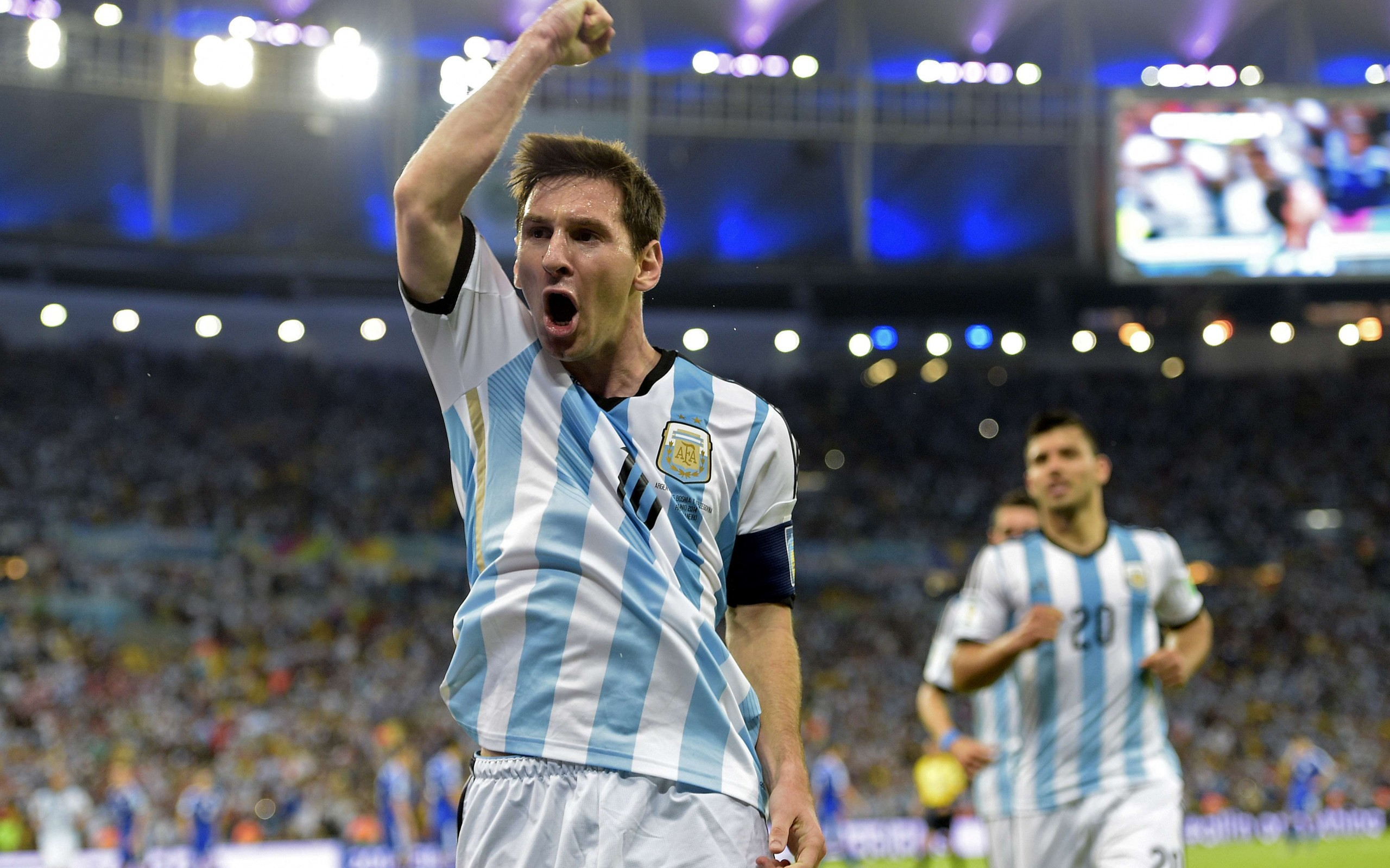 Description: A man celebrating a goal in a soccer game with his team mates in the background and a stadium full of people.
