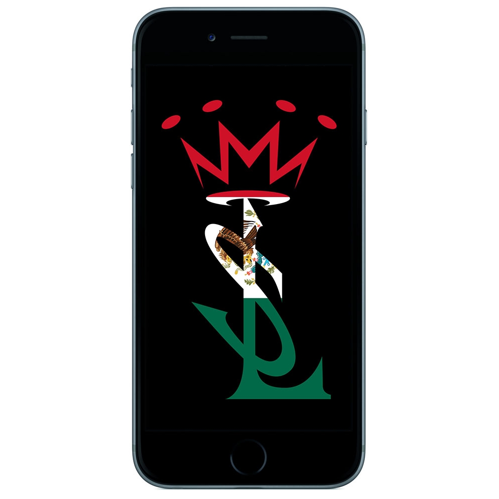 Description: A cell phone with a picture of a crown on it's screen and a green and white logo on the screen.