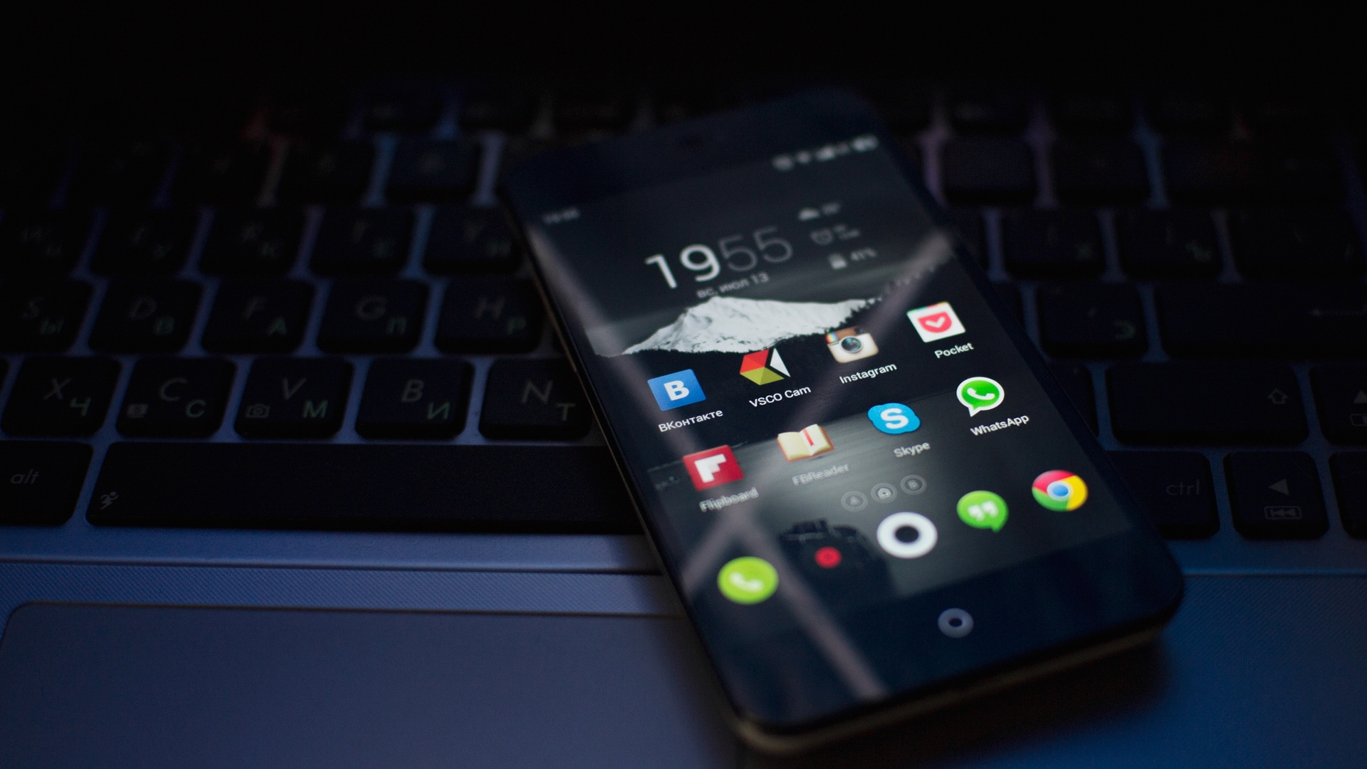 Description: A close up of a cell phone on a keyboard with a dark background and a blue key board with a black keyboard.