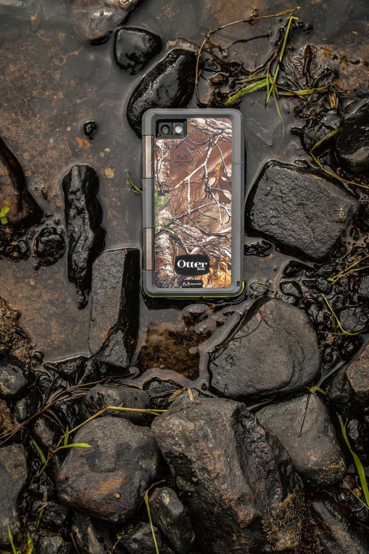 Description: A cell phone laying on top of a rocky beach covered in water and grass next to rocks and grass.
